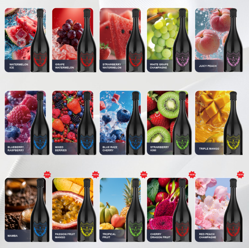 Visually, the champagne-bottle styling gives it a more polished and gift-like look, which may appeal to users who care about both product appearance and flavour variety. It works especially well for those who prefer fruit-heavy profiles but still want some sweeter or drink-inspired options in the same range.