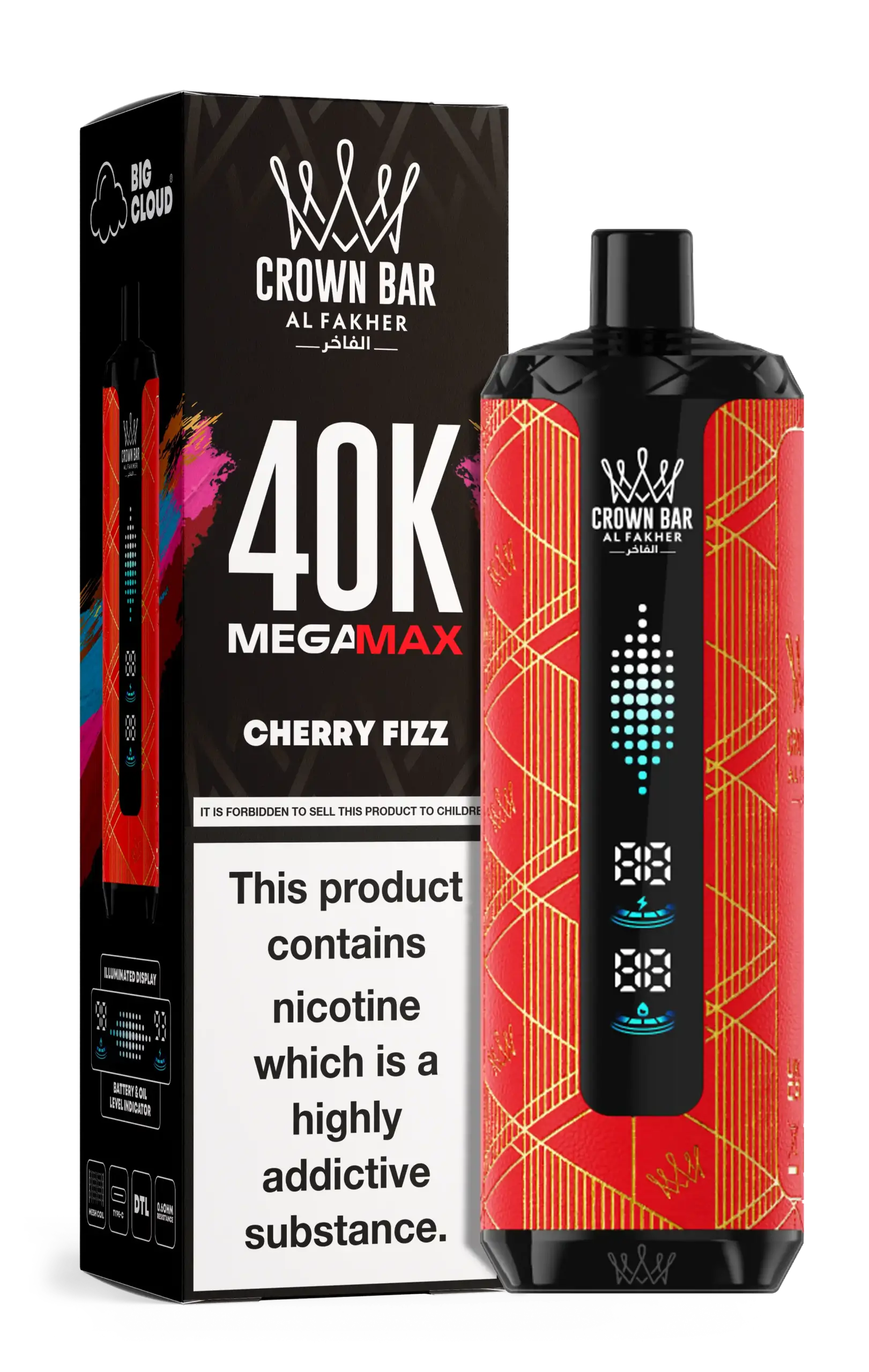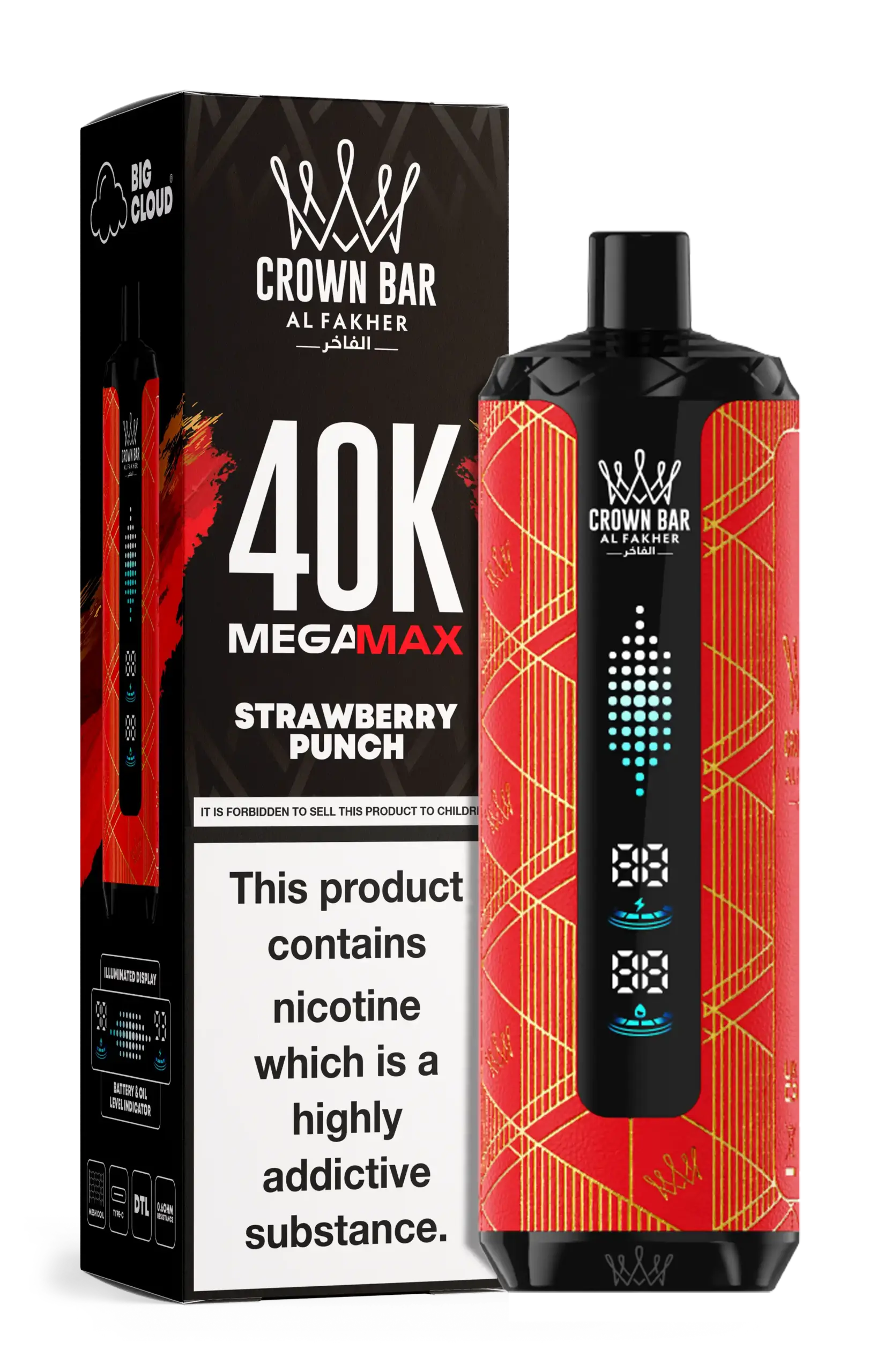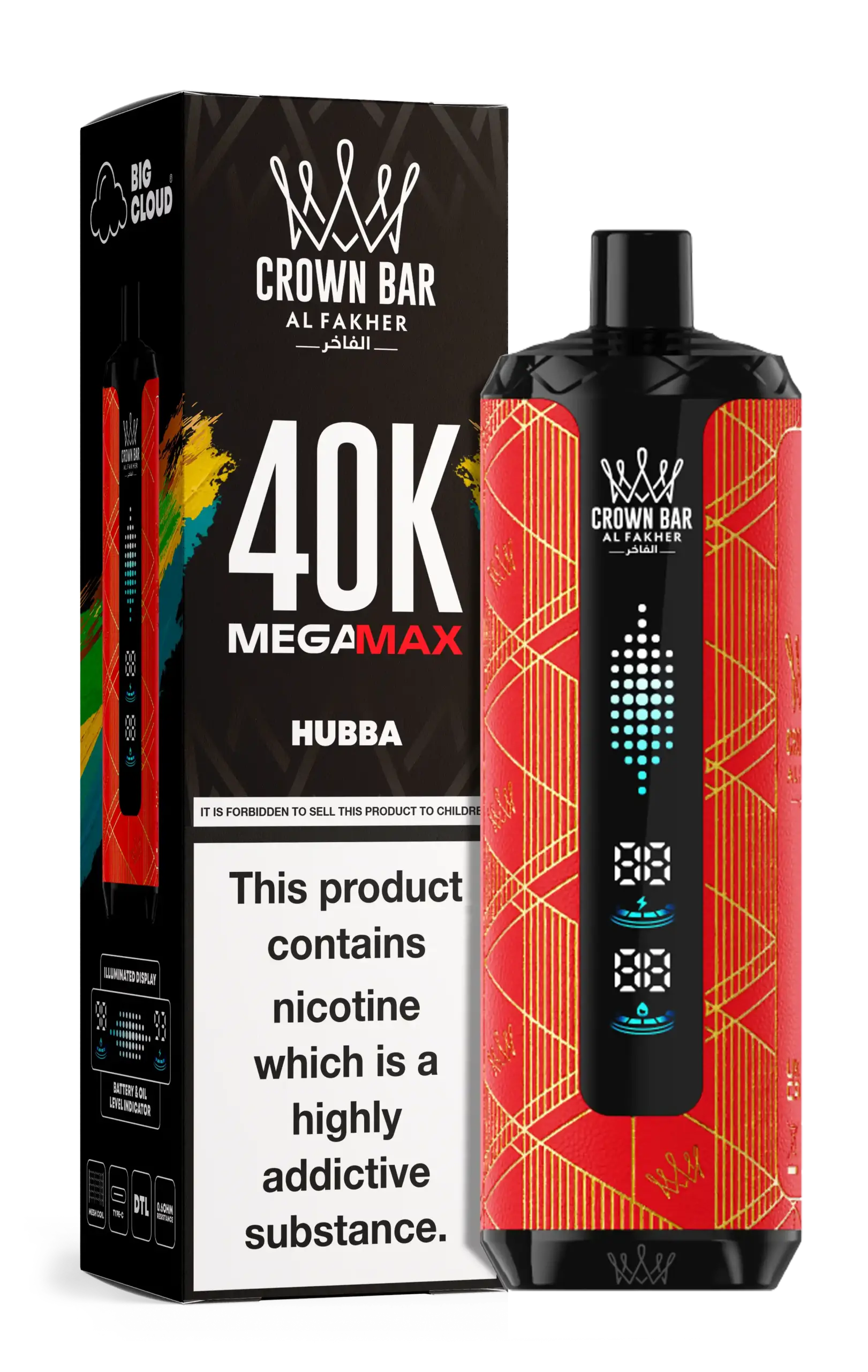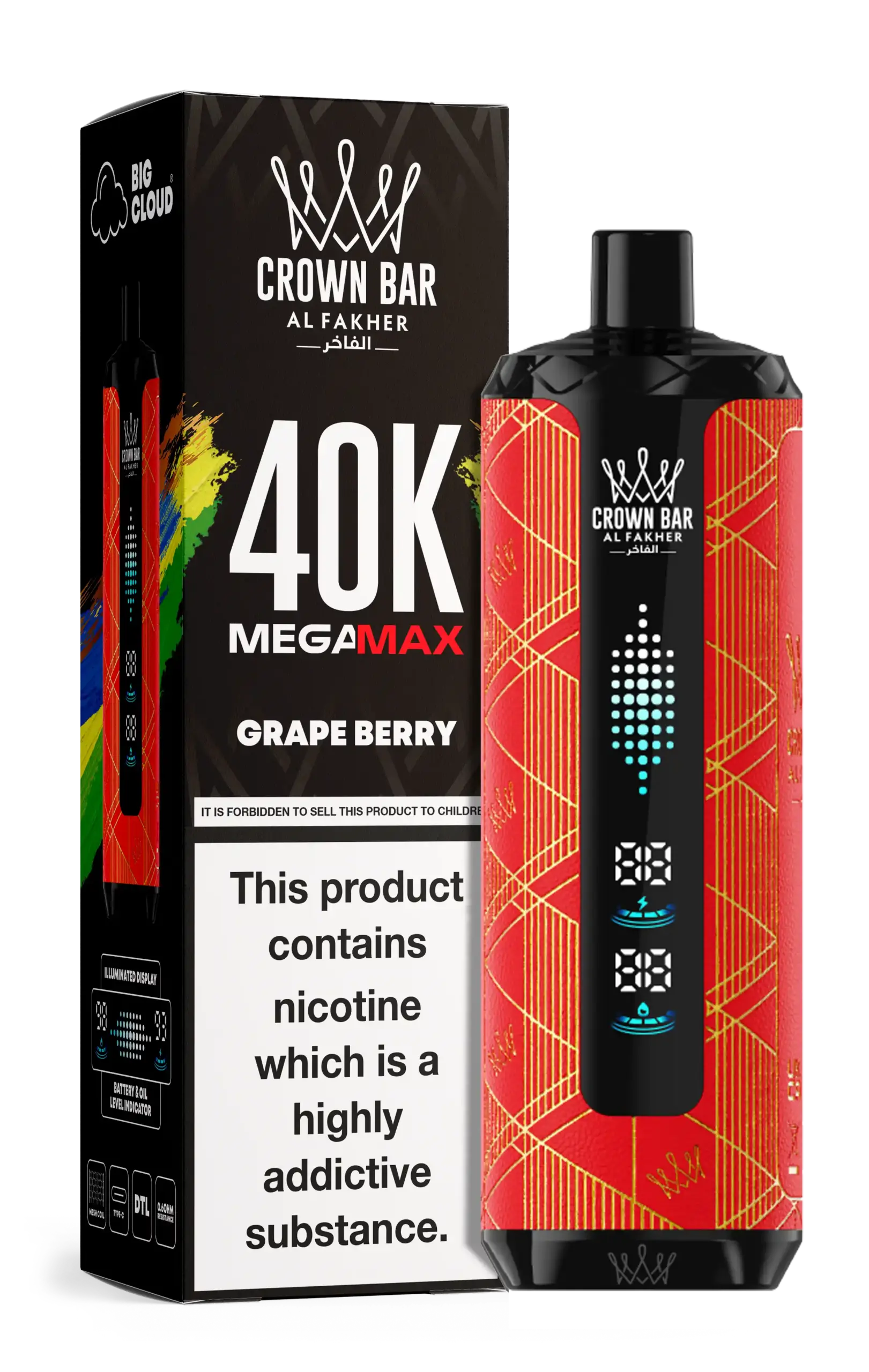 The Al Fakher Crown Bar Mega Max 40000 is built for users who want a higher-capacity disposable with a bold visual style and a broad flavour range to choose from. With up to 40000 puffs, 30ml capacity, and a 950mAh battery, it sits in the longer-use category for users who prefer fewer replacements and a more substantial everyday device. The black-and-red finish shown in the latest image also gives it a more distinctive shelf presence than a plain single-colour design.