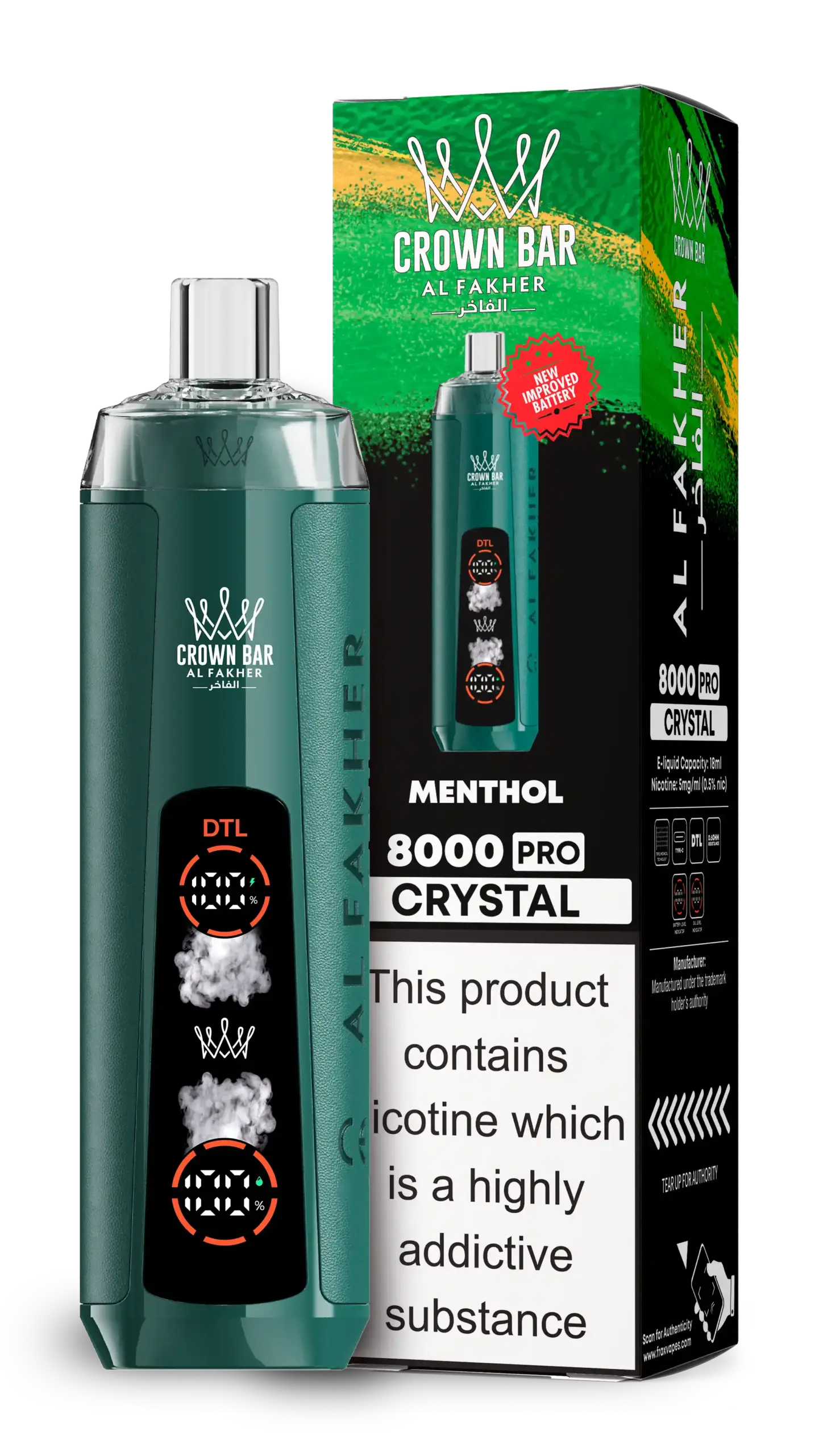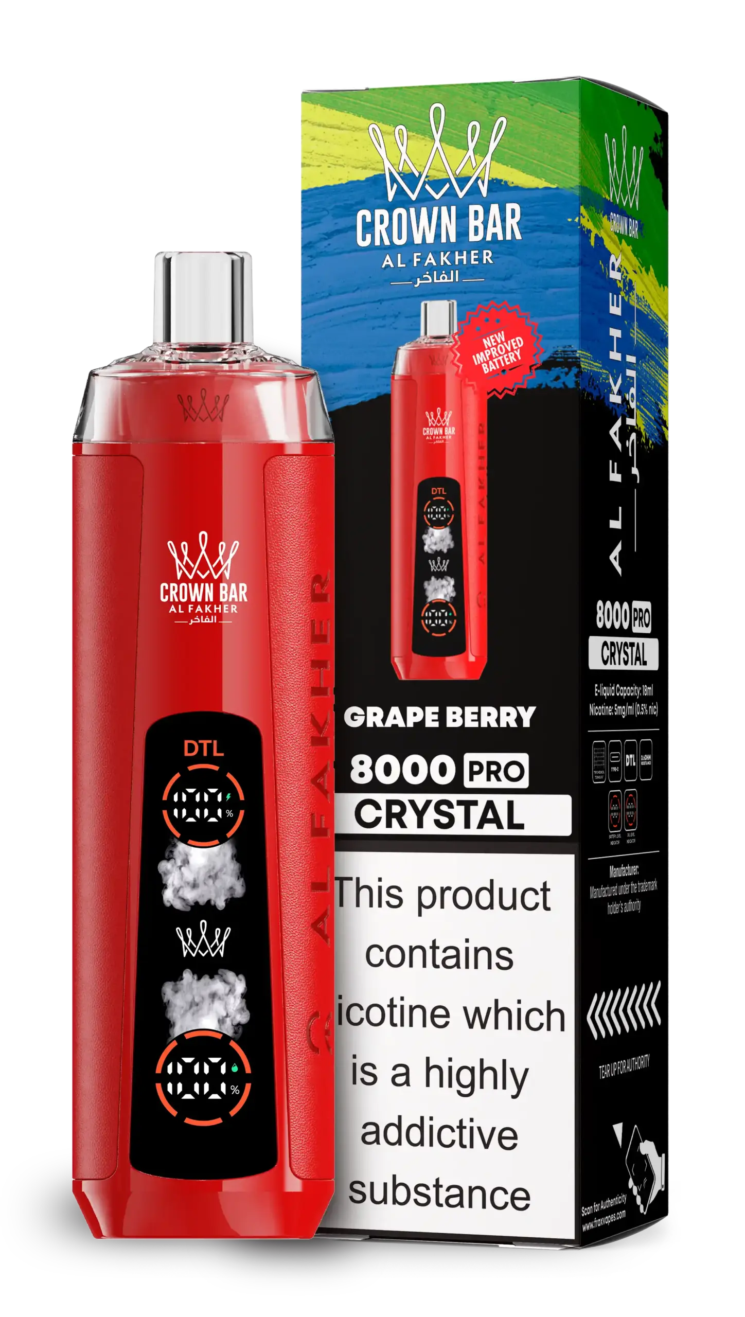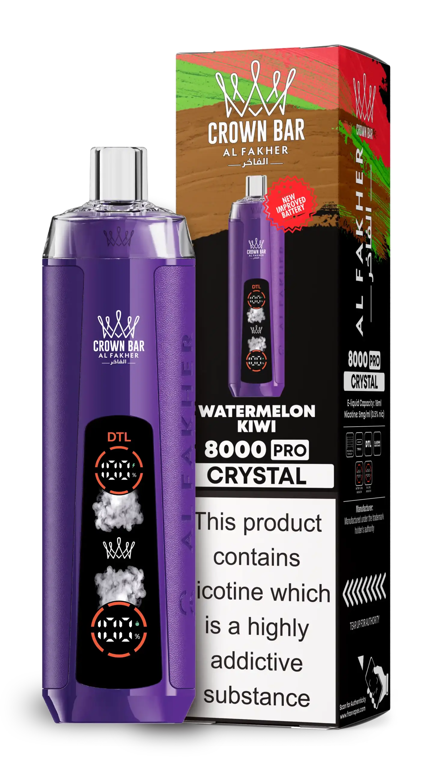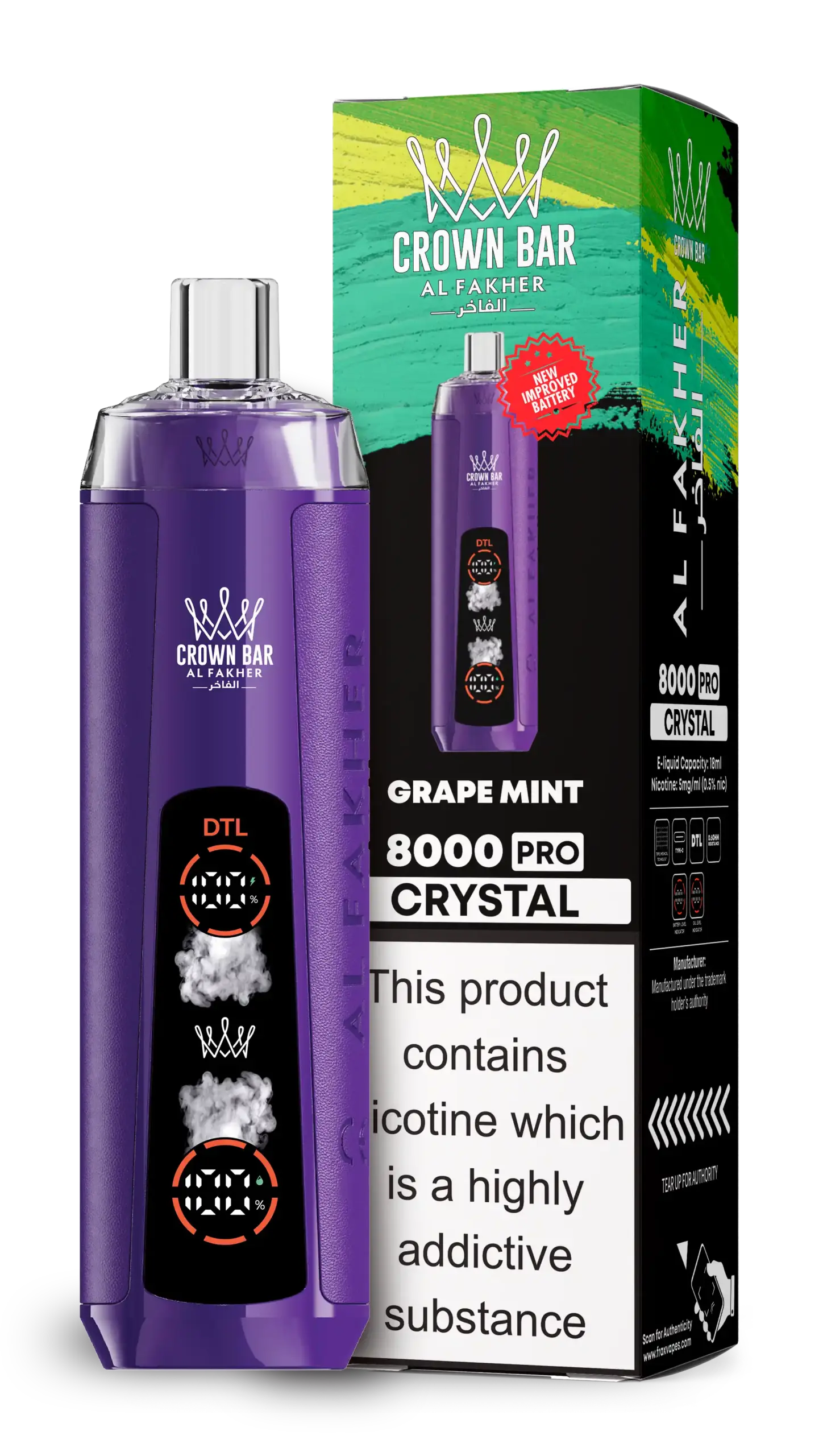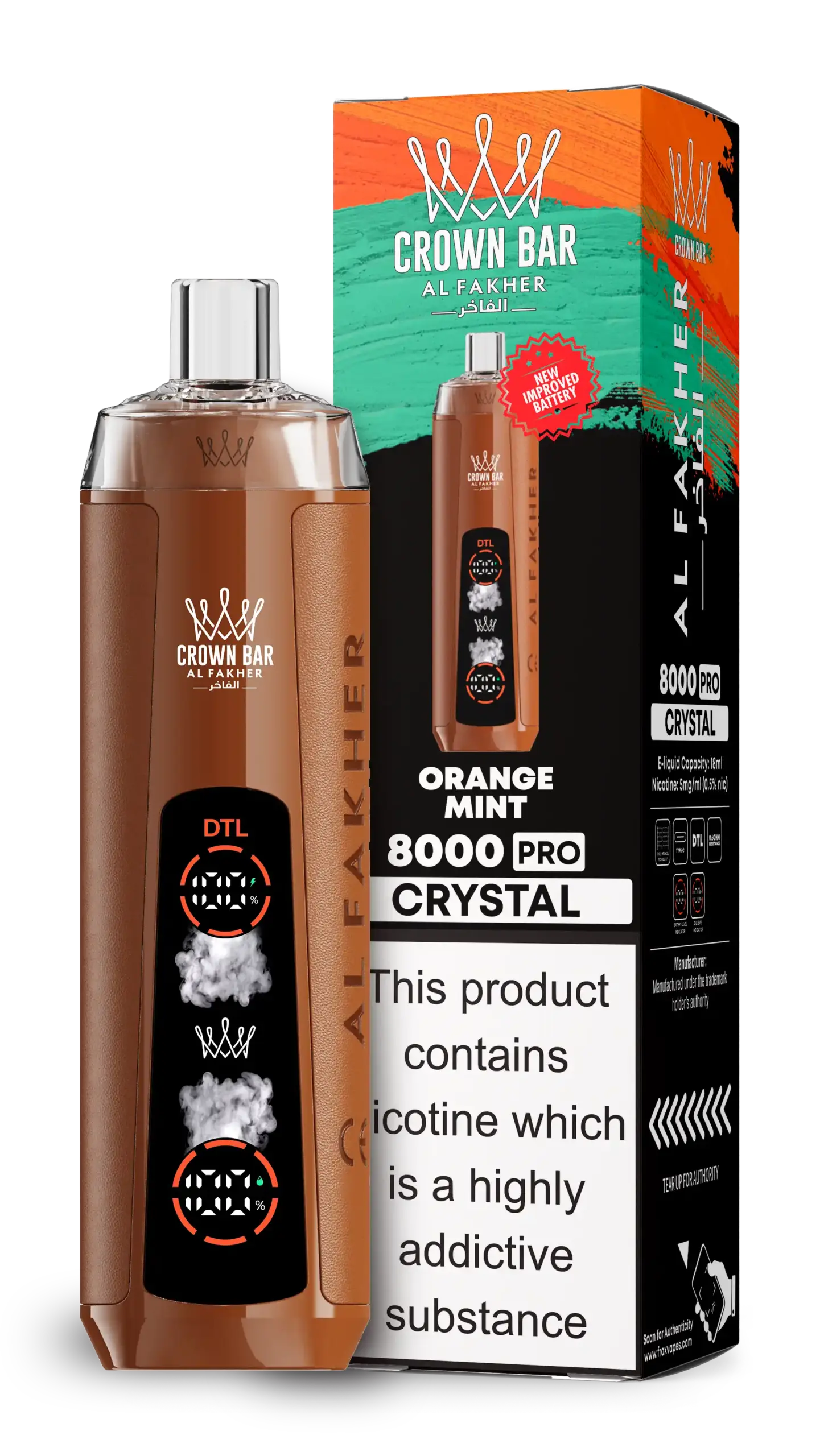 The Al Fakher Crystal 8000 is a compact higher-capacity disposable for users who want a more refined daily-use format without moving into an oversized device. Built around the 8000-puff class, with 18ml capacity, a 1200mAh battery, and a broad 45-flavour lineup, it balances practical everyday use with a cleaner crystal-style look. The latest image also gives it a stronger shelf presence, with a leather-like outer finish, clear upper section, and a front screen layout that makes the design feel more polished than a plain basic disposable.