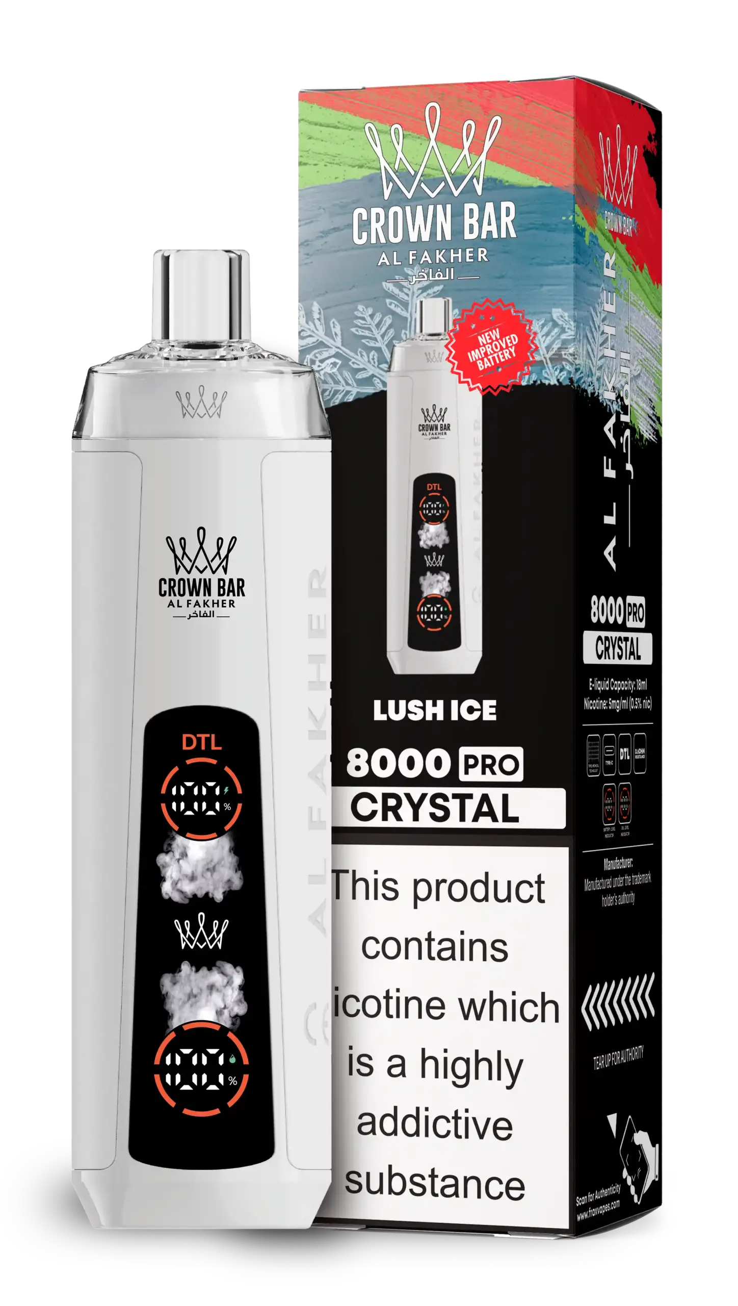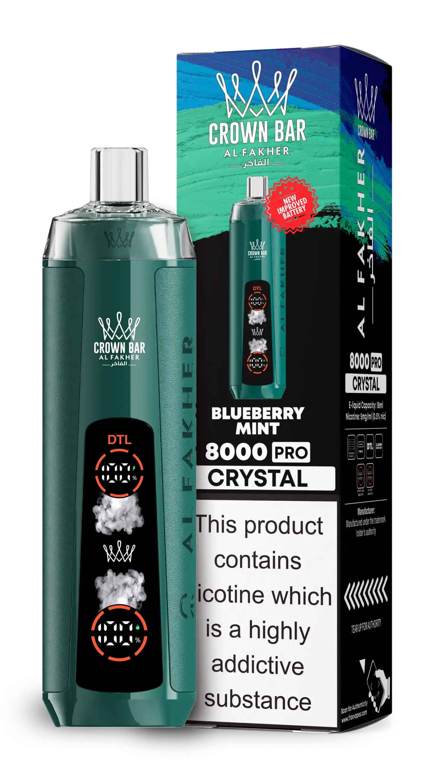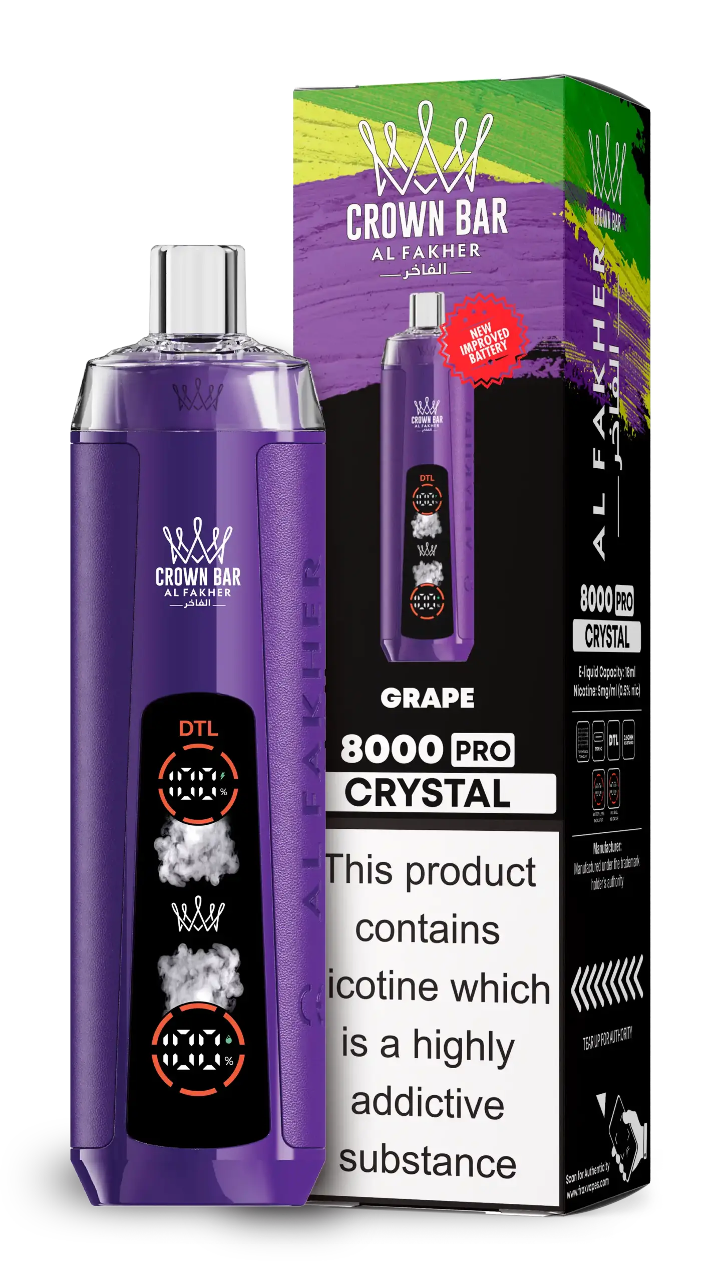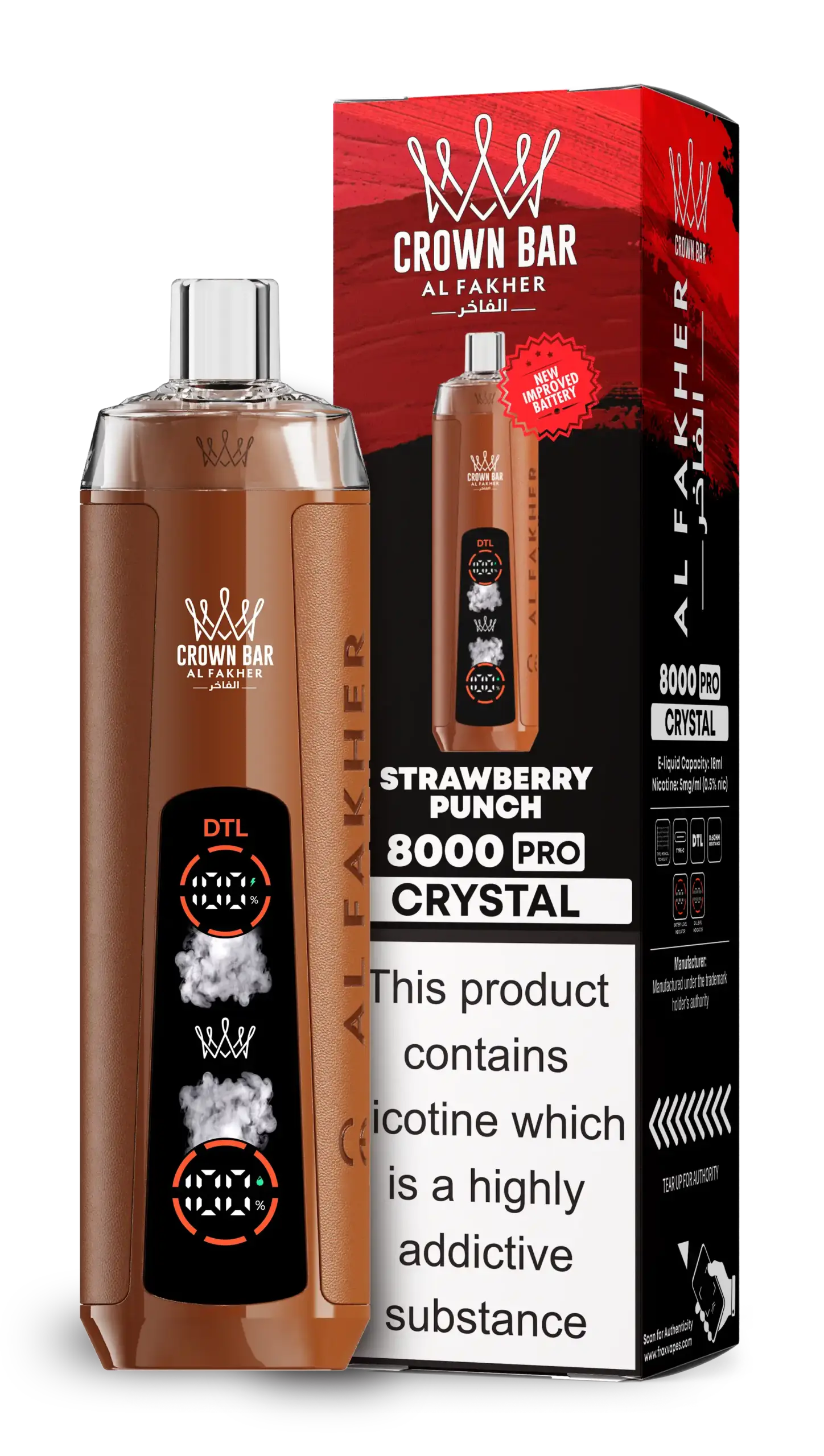 The Al Fakher Crystal 8000 is a compact higher-capacity disposable for users who want a more refined daily-use format without moving into an oversized device. Built around the 8000-puff class, with 18ml capacity, a 1200mAh battery, and a broad 45-flavour lineup, it balances practical everyday use with a cleaner crystal-style look. The latest image also gives it a stronger shelf presence, with a leather-like outer finish, clear upper section, and a front screen layout that makes the design feel more polished than a plain basic disposable.