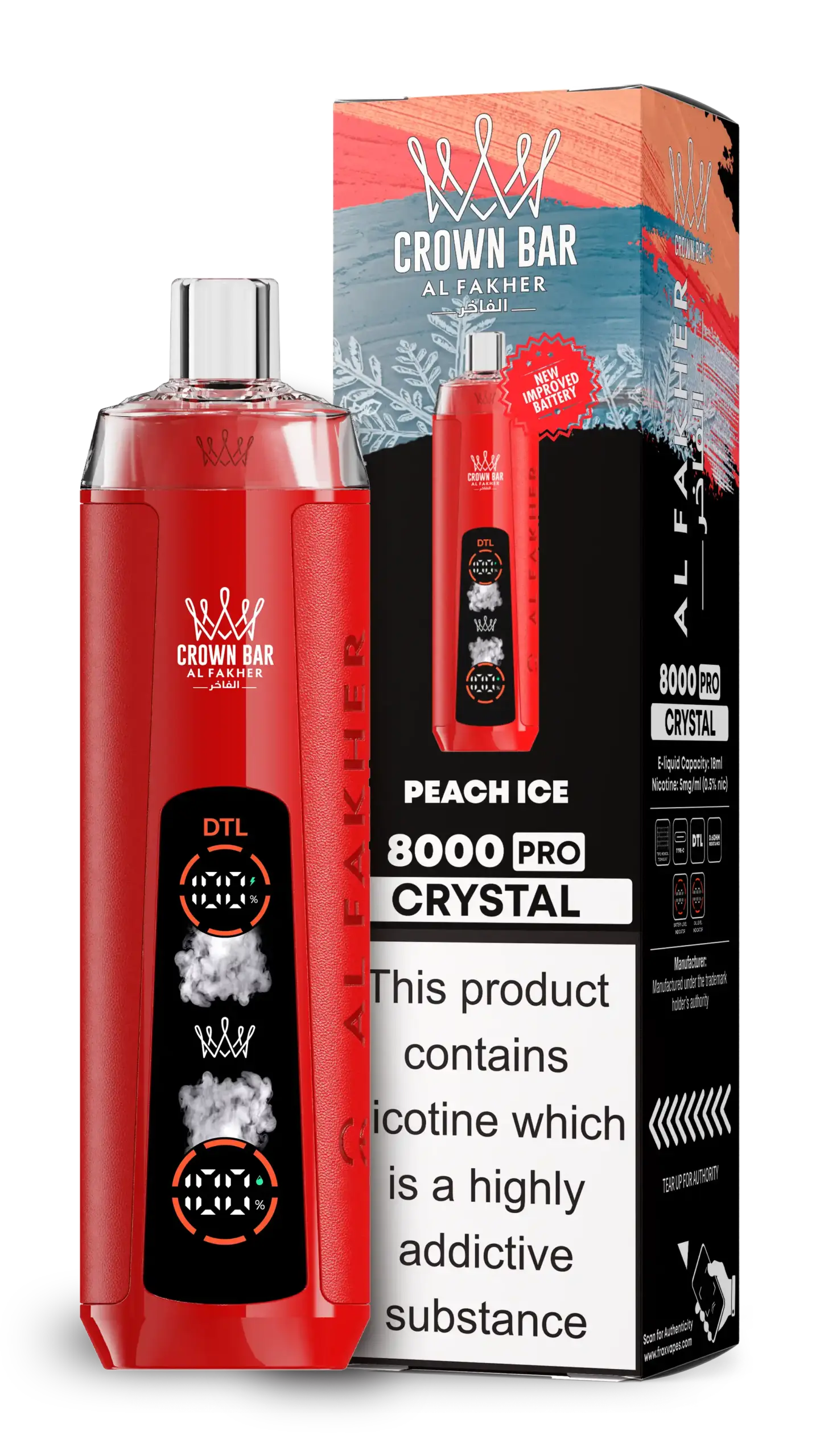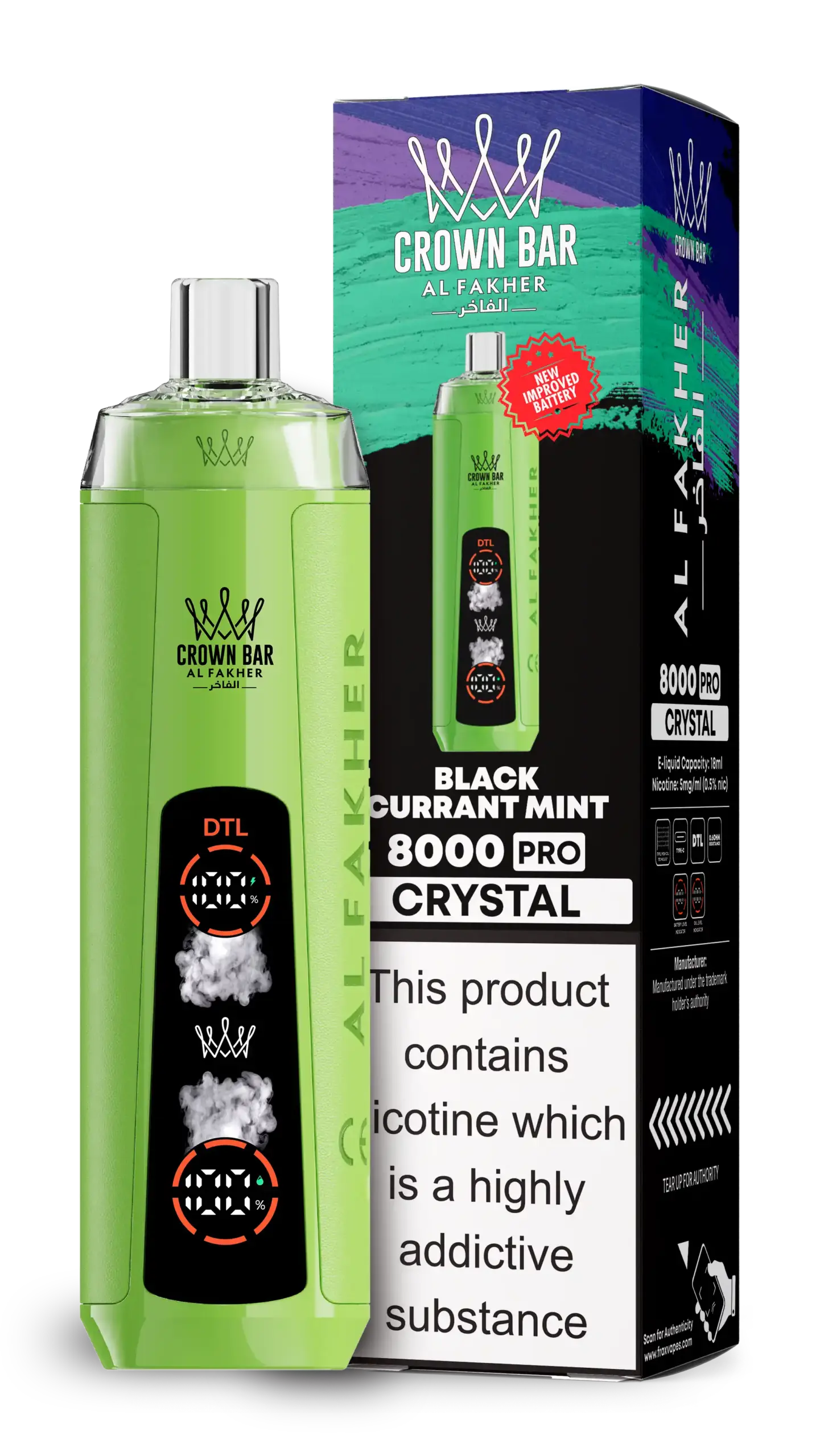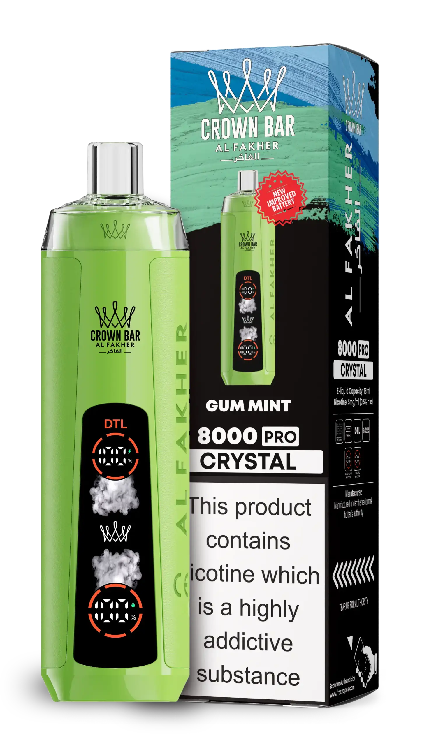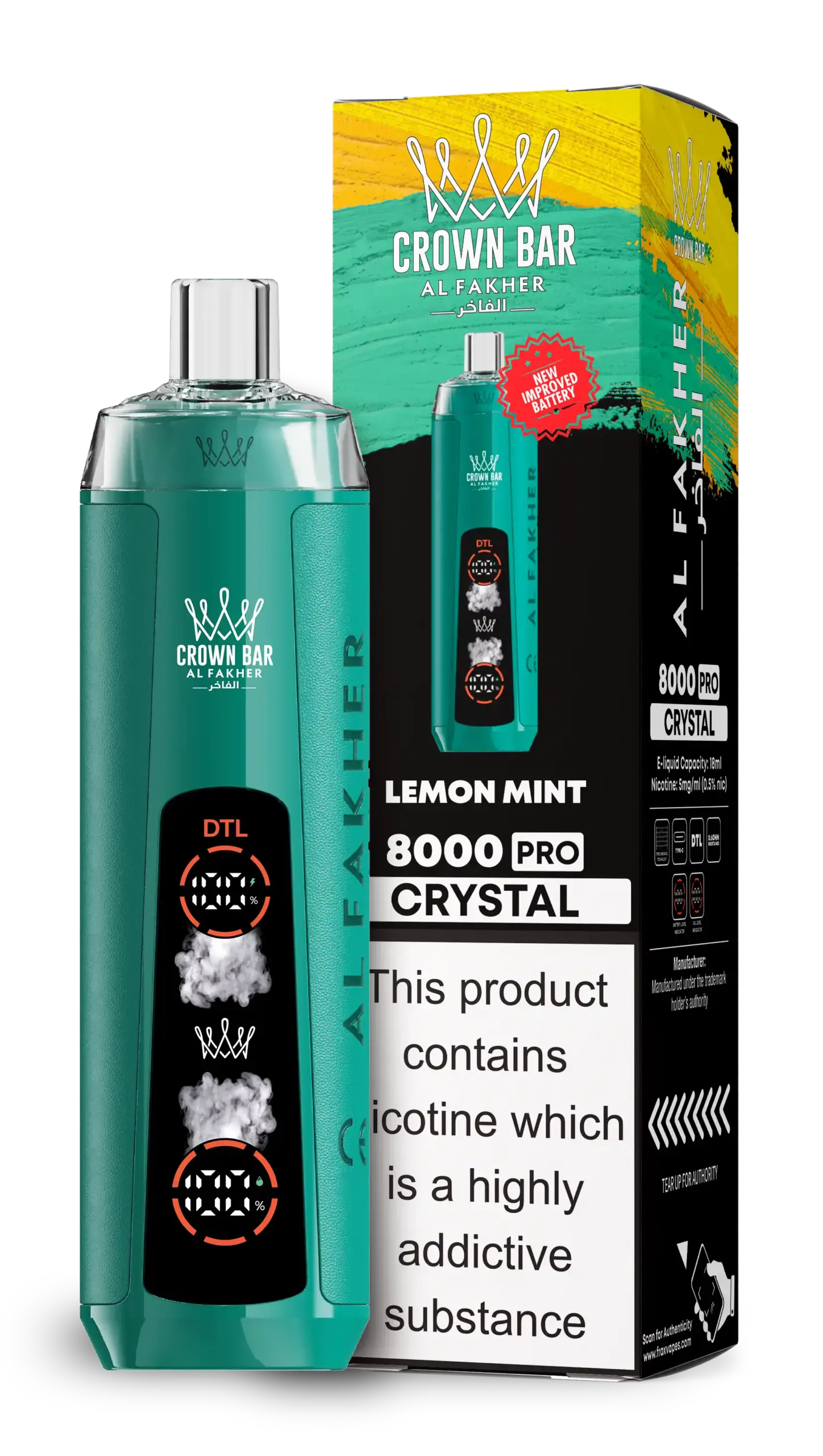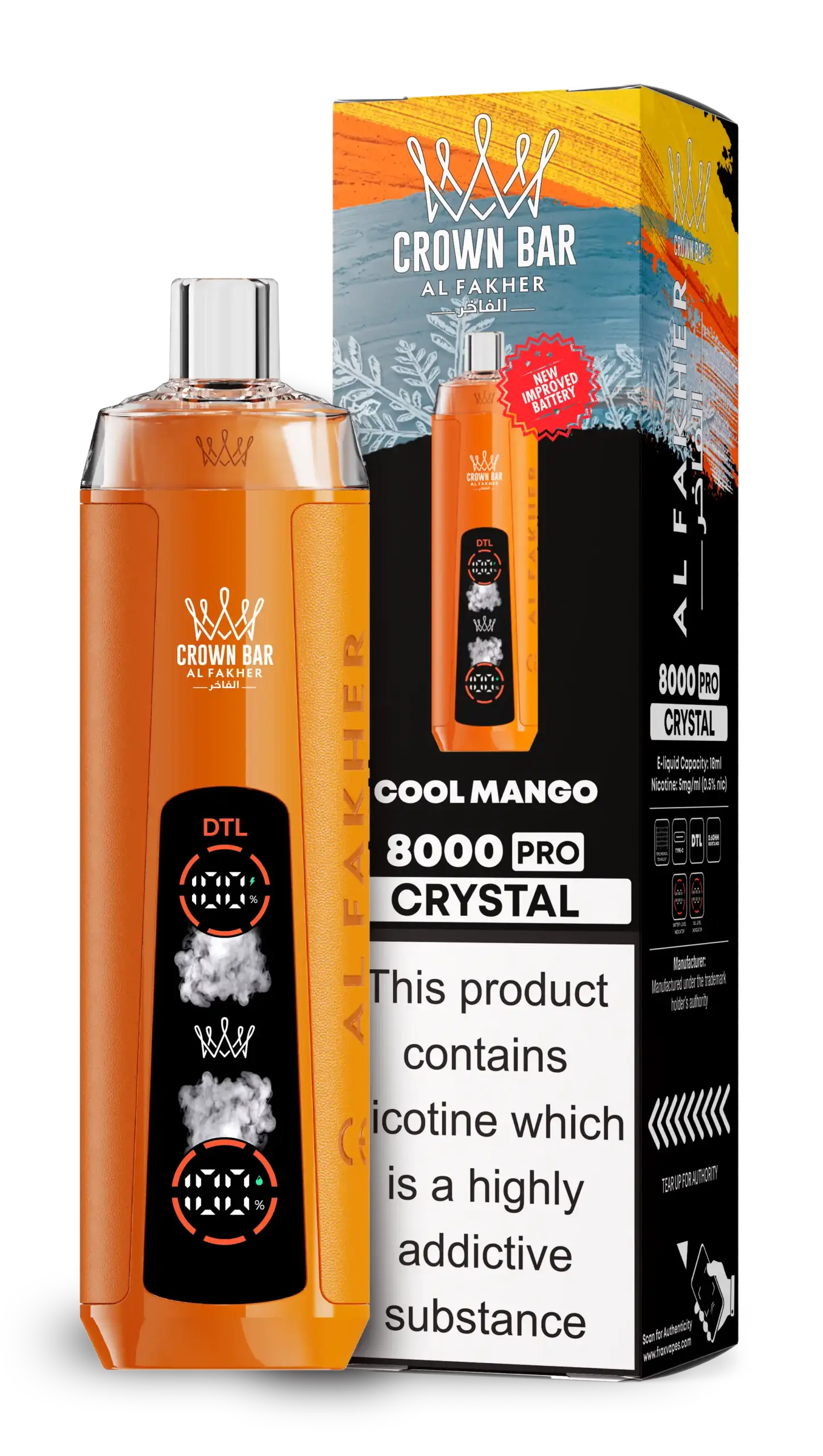 The Al Fakher Crystal 8000 is a compact higher-capacity disposable for users who want a more refined daily-use format without moving into an oversized device. Built around the 8000-puff class, with 18ml capacity, a 1200mAh battery, and a broad 45-flavour lineup, it balances practical everyday use with a cleaner crystal-style look. The latest image also gives it a stronger shelf presence, with a leather-like outer finish, clear upper section, and a front screen layout that makes the design feel more polished than a plain basic disposable.