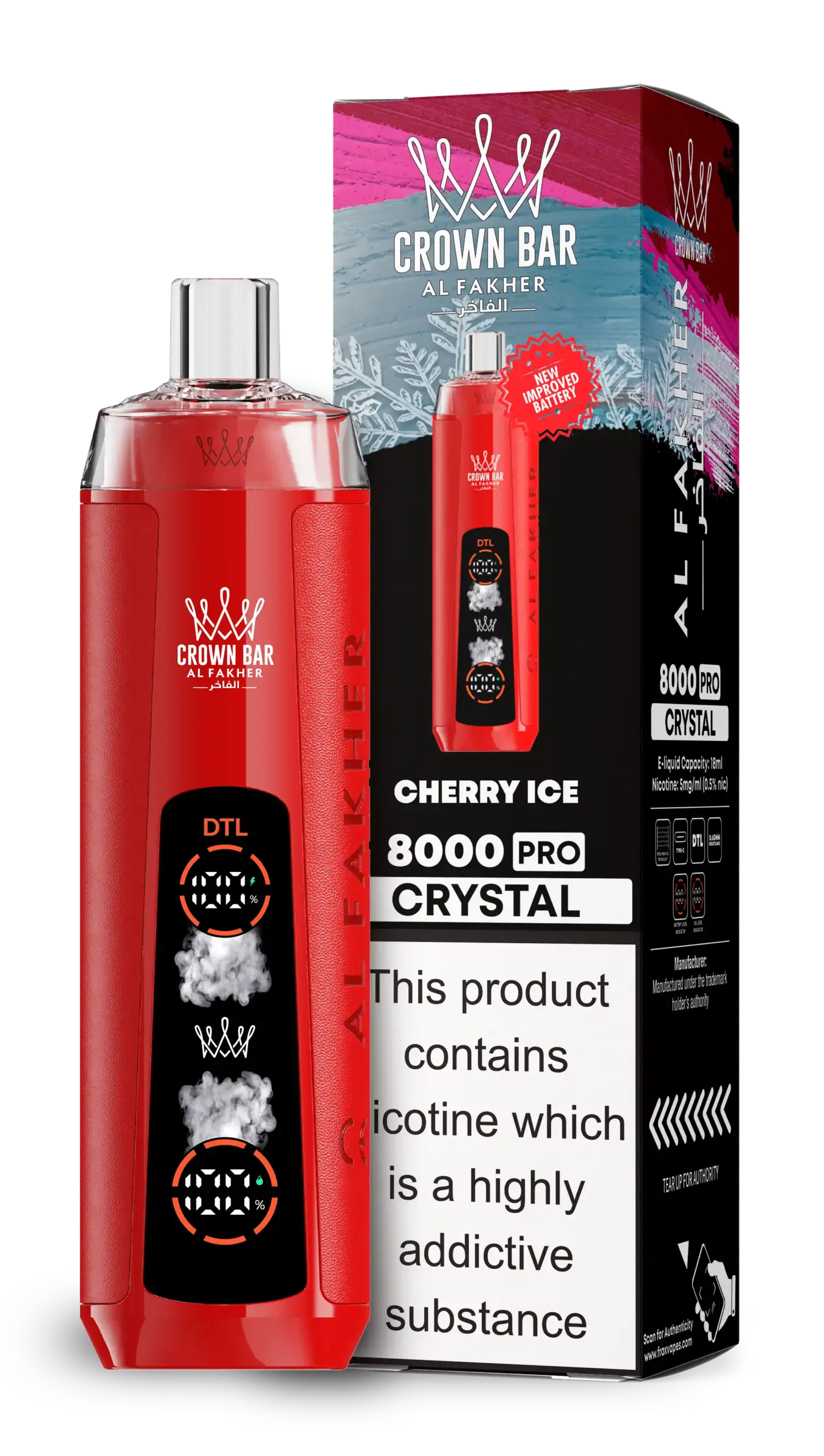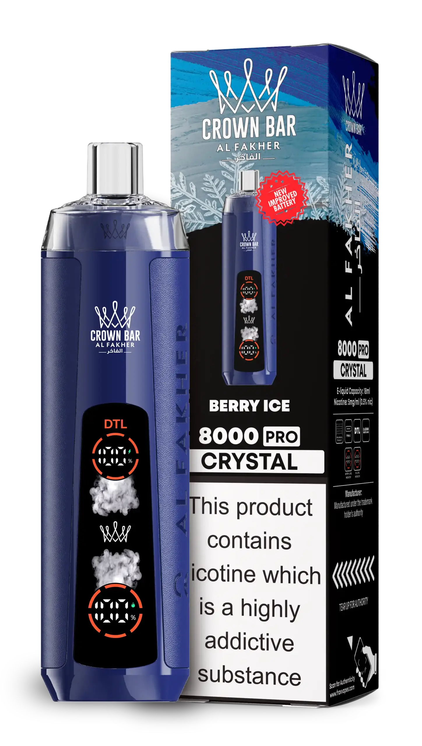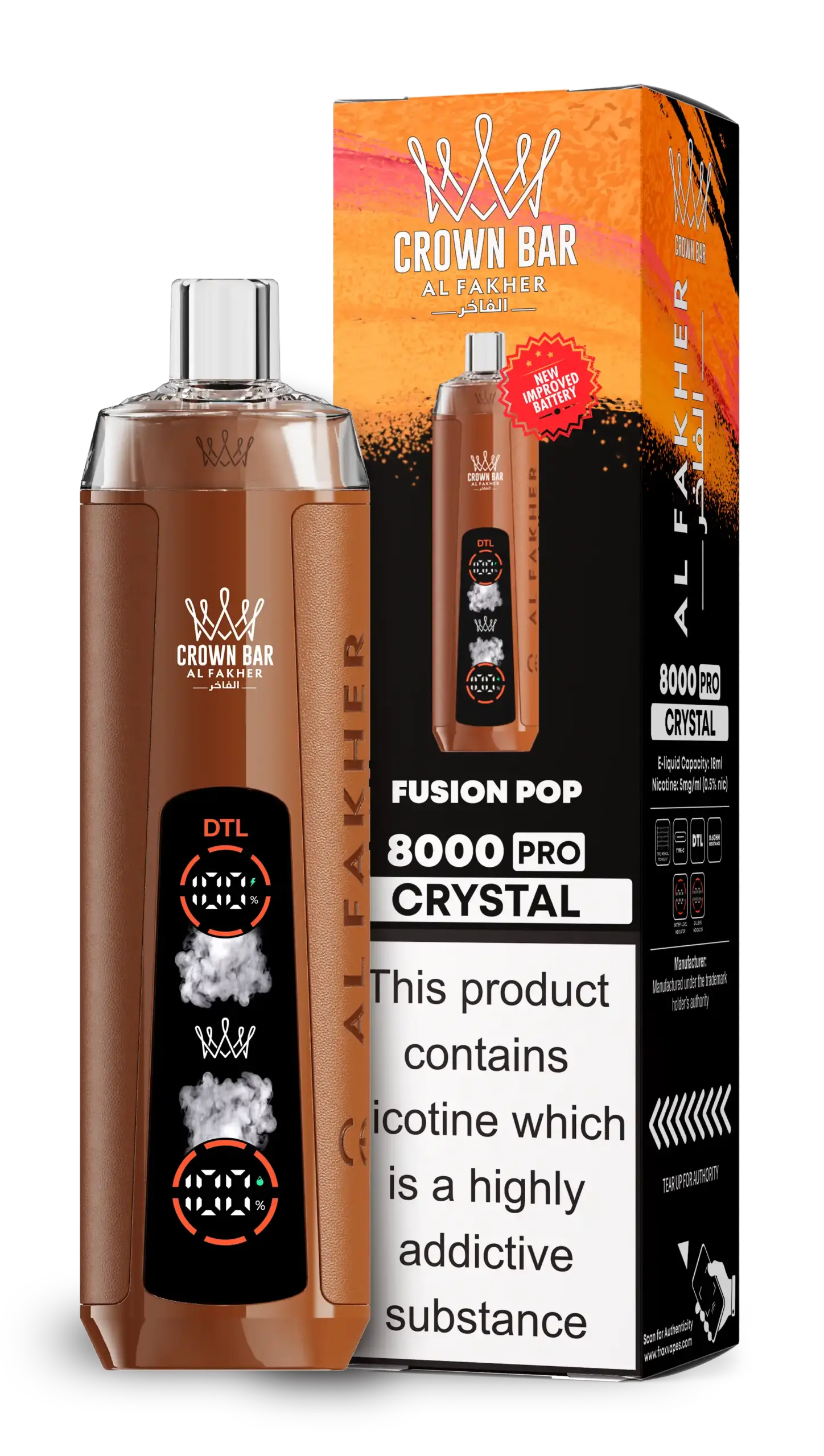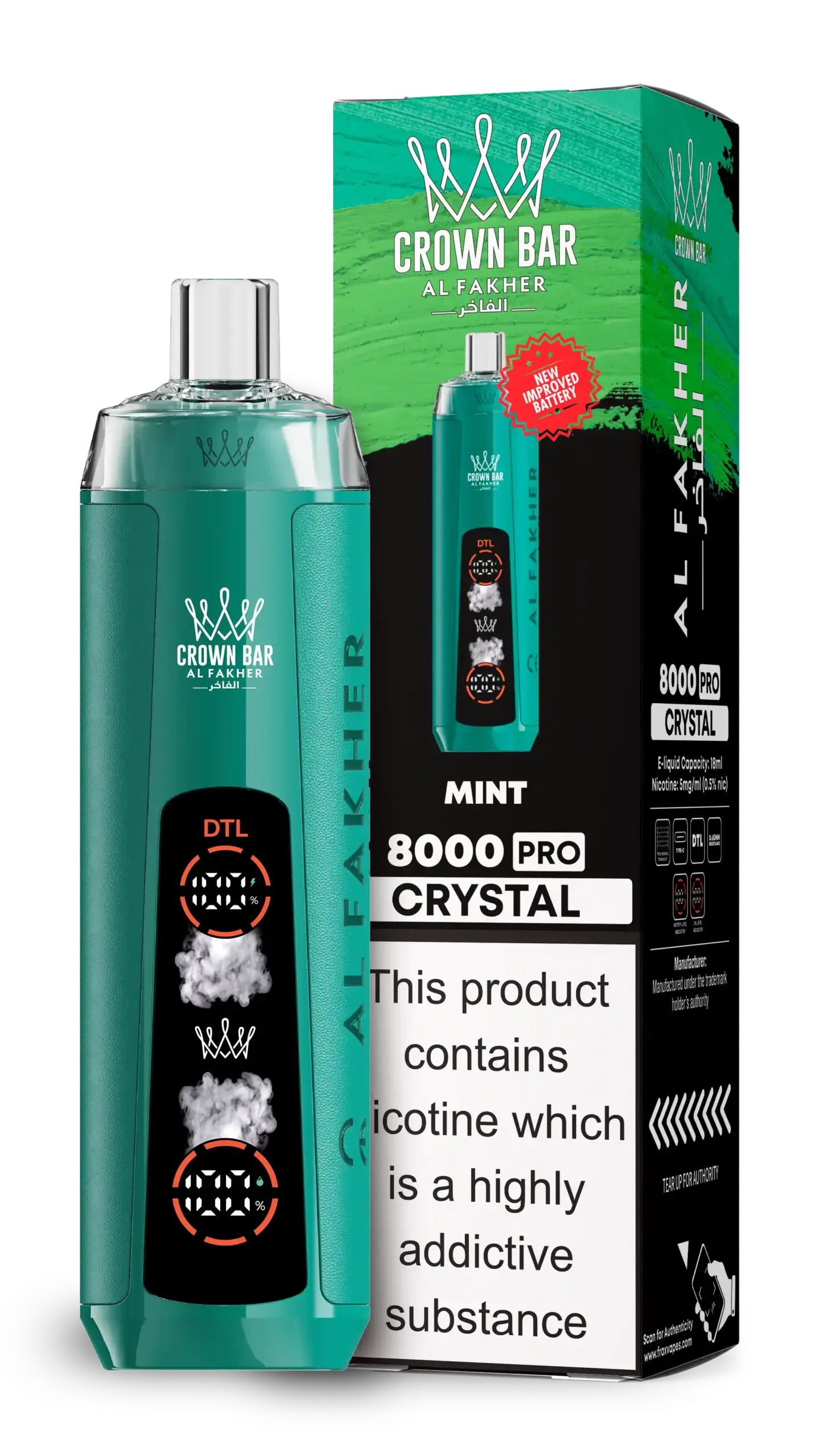The Al Fakher Crystal 8000 is a compact higher-capacity disposable for users who want a more refined daily-use format without moving into an oversized device. Built around the 8000-puff class, with 18ml capacity, a 1200mAh battery, and a broad 45-flavour lineup, it balances practical everyday use with a cleaner crystal-style look. The latest image also gives it a stronger shelf presence, with a leather-like outer finish, clear upper section, and a front screen layout that makes the design feel more polished than a plain basic disposable.