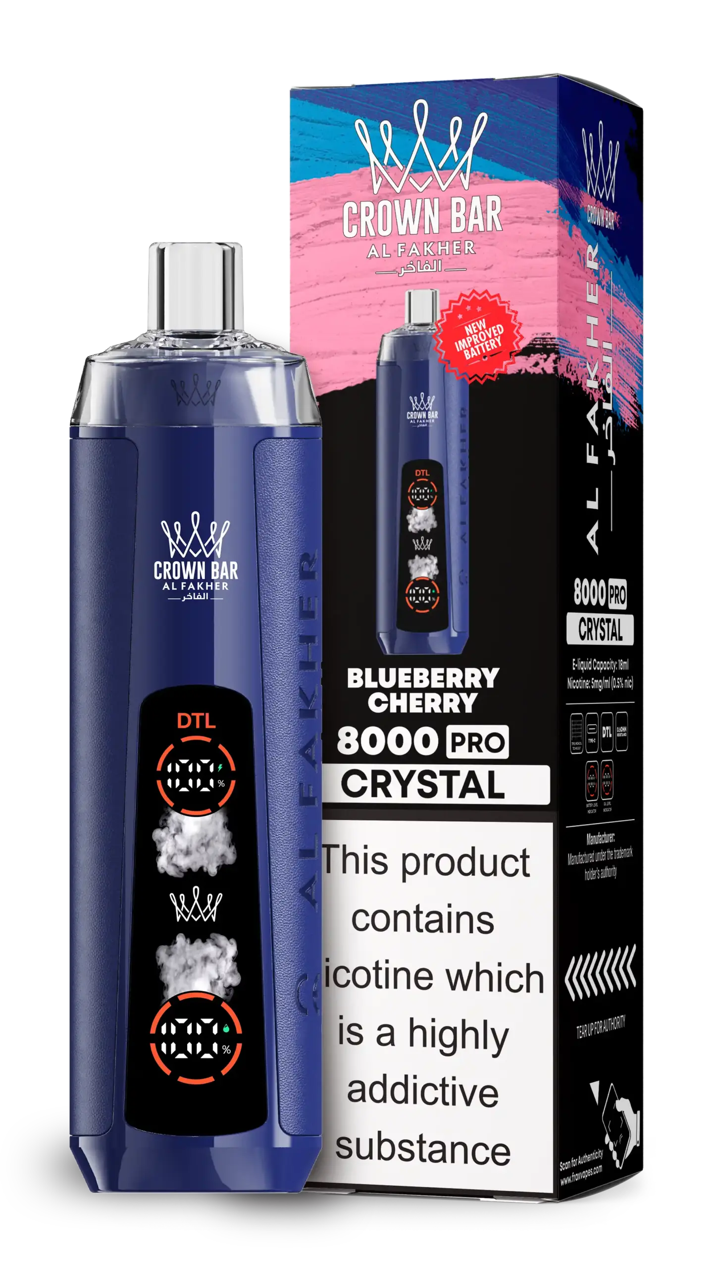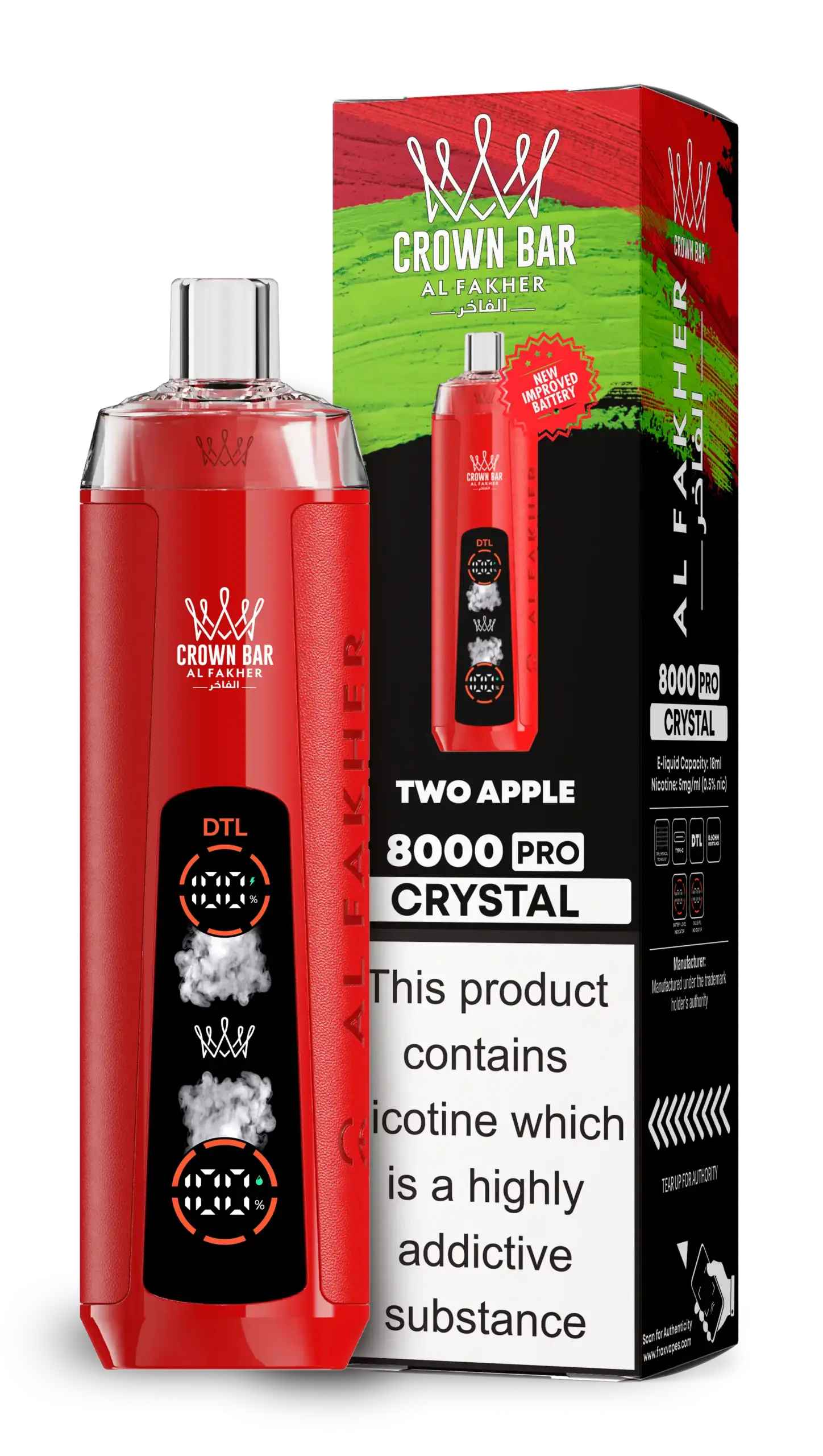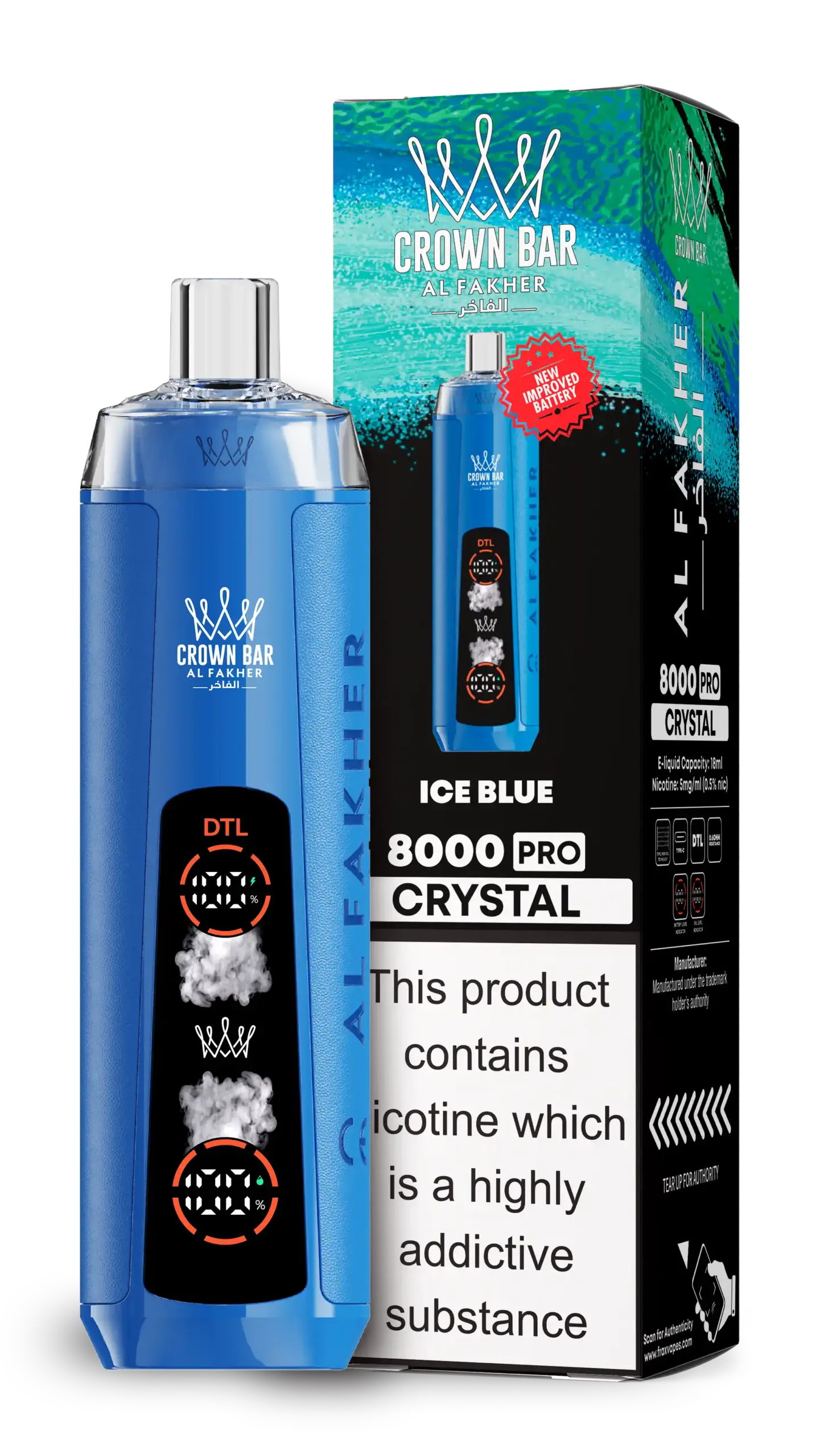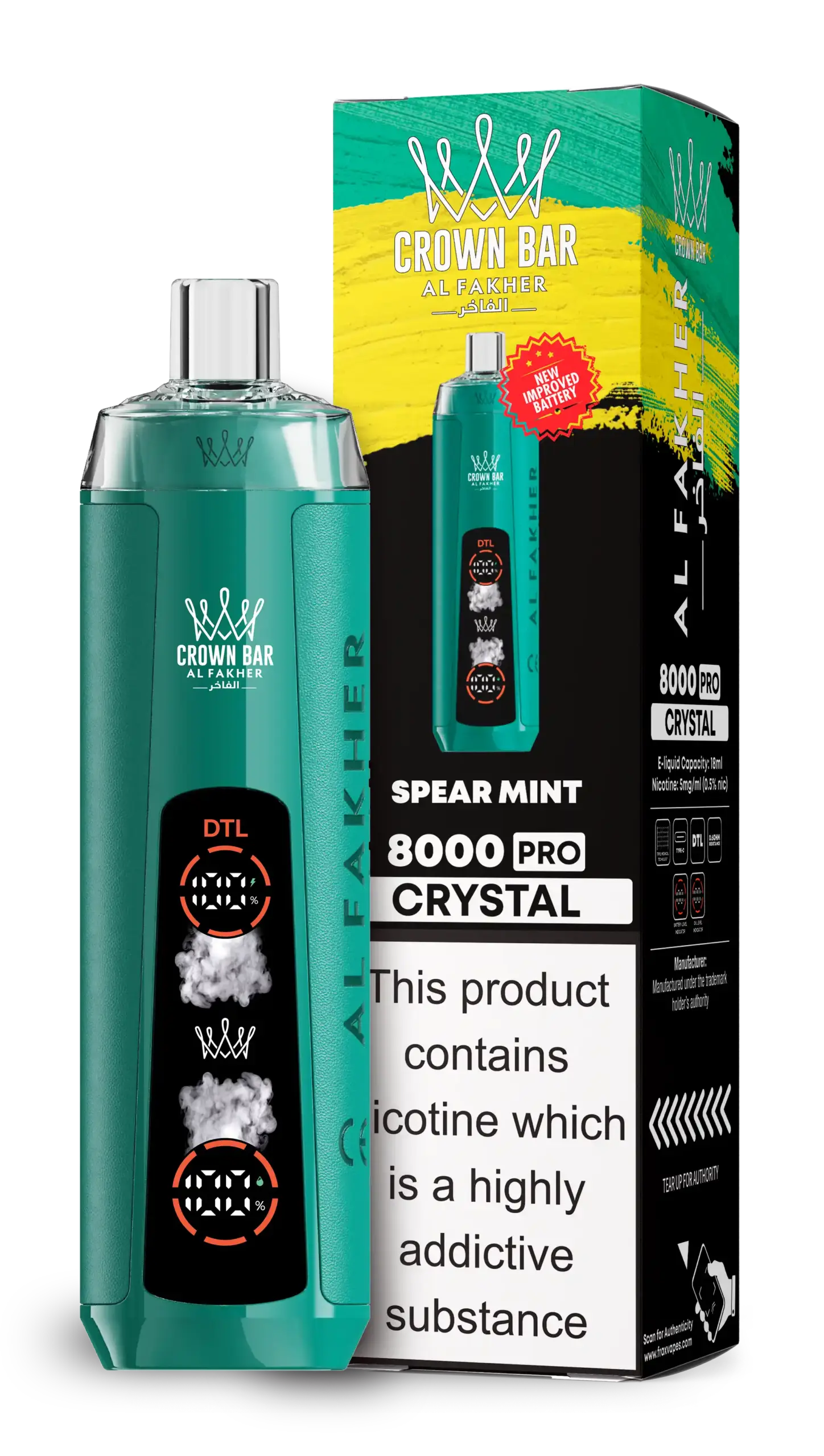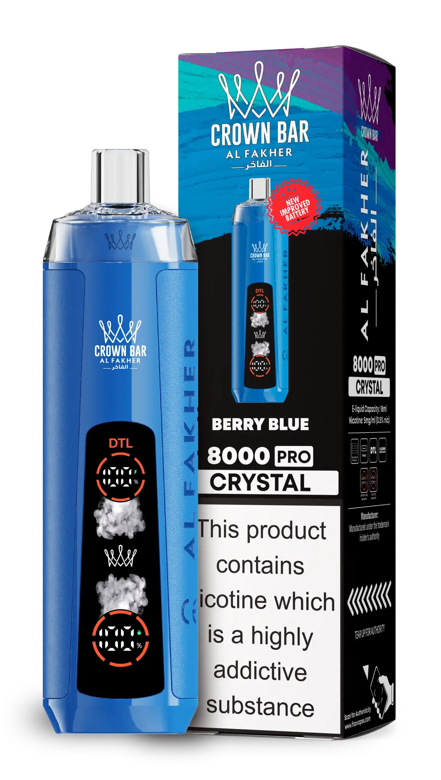 The Al Fakher Crystal 8000 is a compact higher-capacity disposable for users who want a more refined daily-use format without moving into an oversized device. Built around the 8000-puff class, with 18ml capacity, a 1200mAh battery, and a broad 45-flavour lineup, it balances practical everyday use with a cleaner crystal-style look. The latest image also gives it a stronger shelf presence, with a leather-like outer finish, clear upper section, and a front screen layout that makes the design feel more polished than a plain basic disposable.