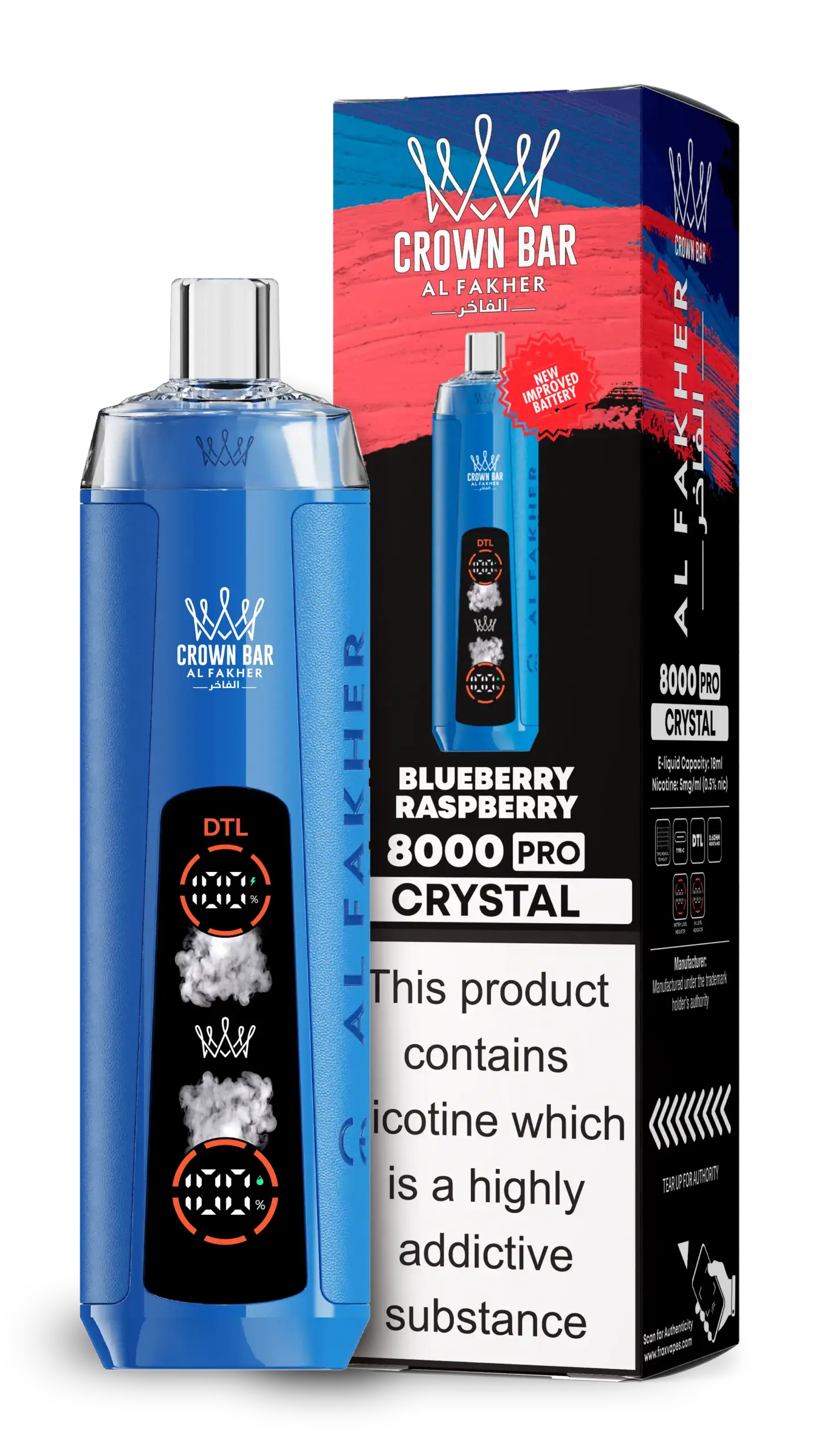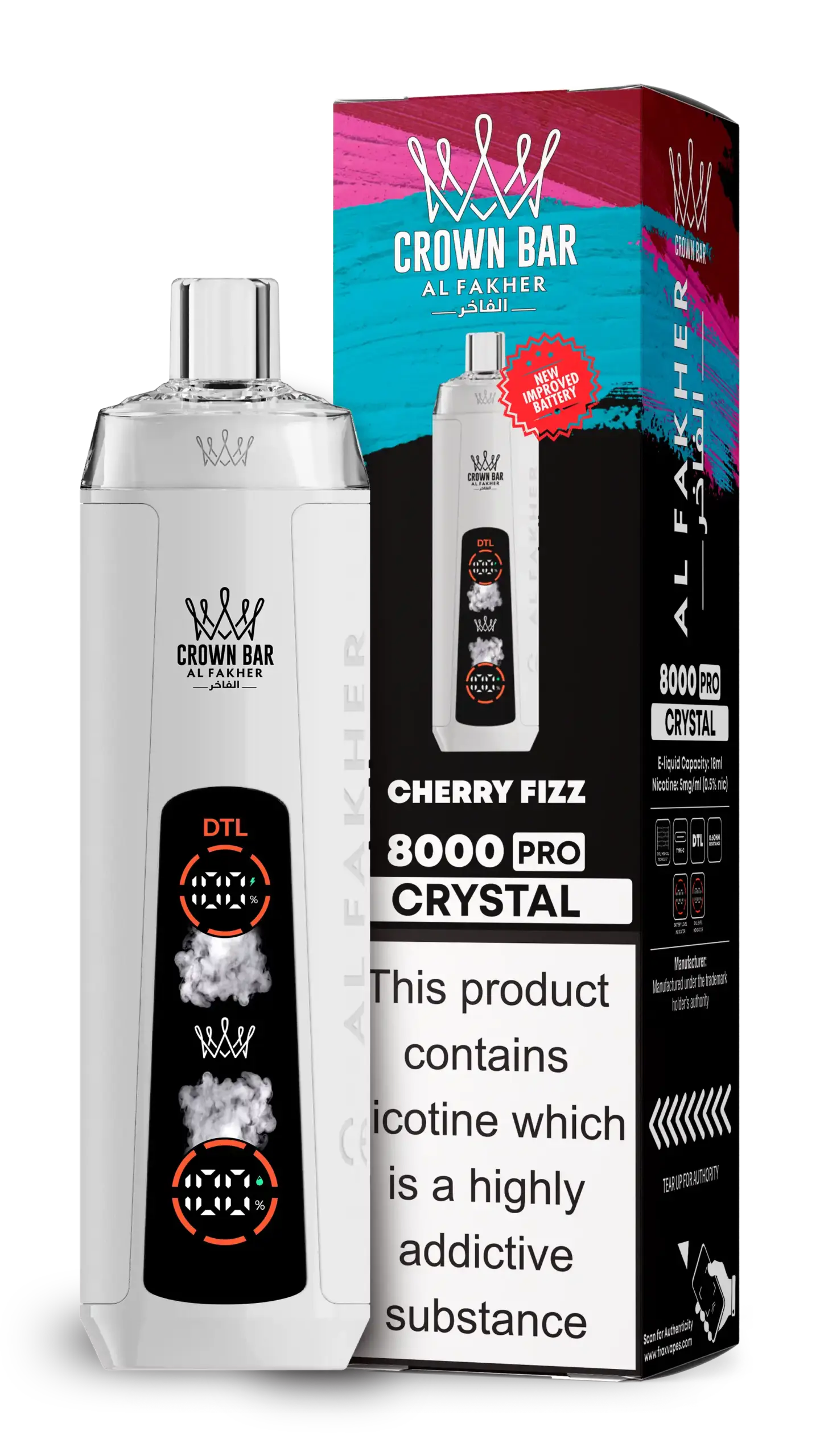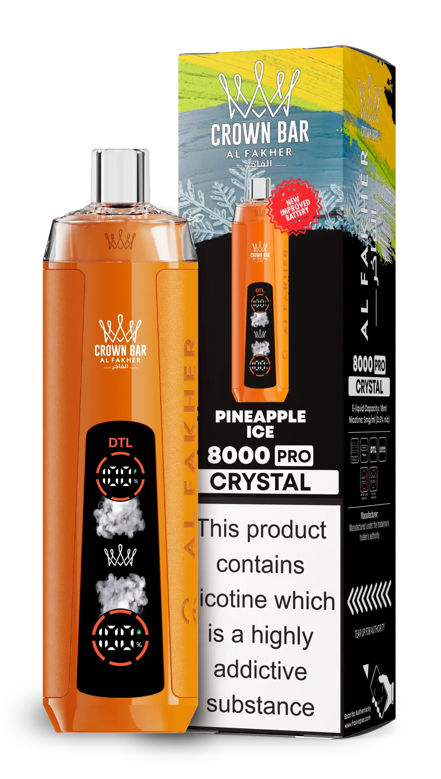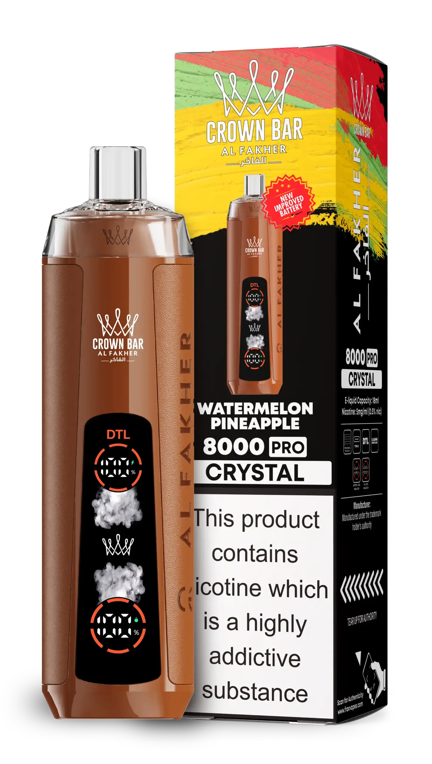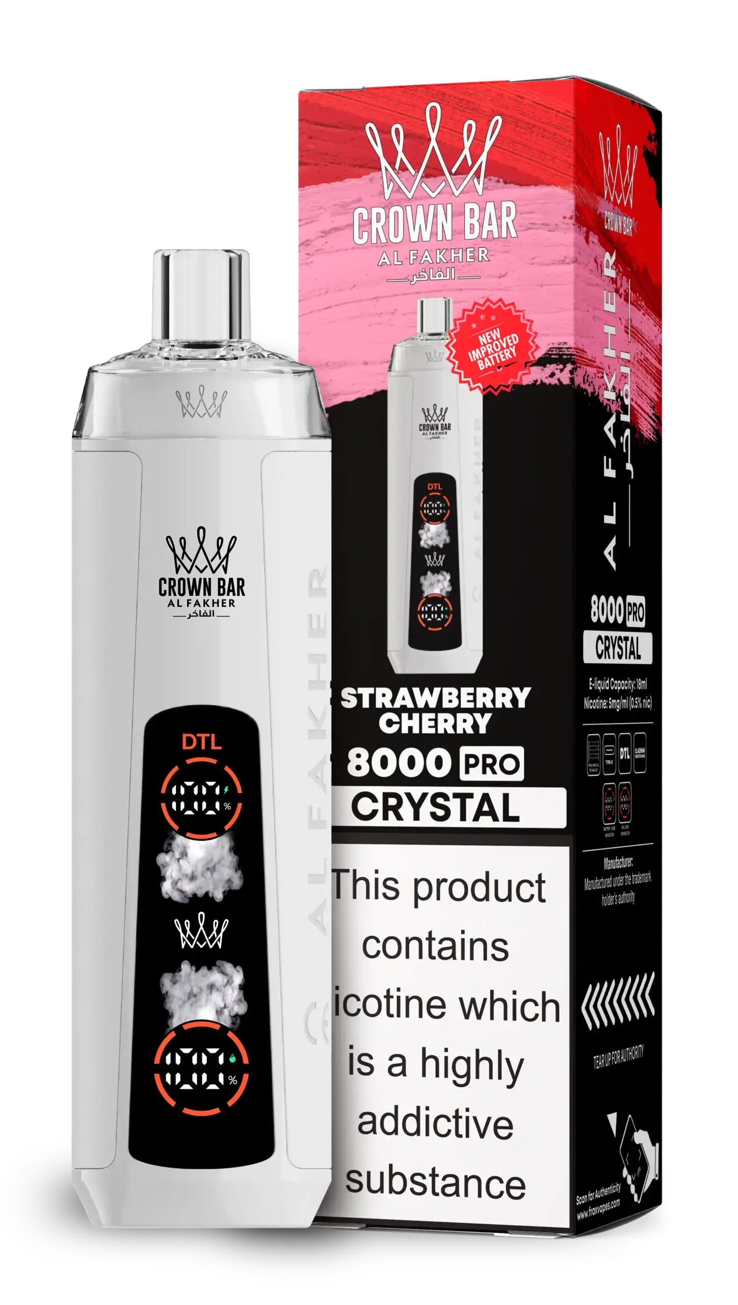 The Al Fakher Crystal 8000 is a compact higher-capacity disposable for users who want a more refined daily-use format without moving into an oversized device. Built around the 8000-puff class, with 18ml capacity, a 1200mAh battery, and a broad 45-flavour lineup, it balances practical everyday use with a cleaner crystal-style look. The latest image also gives it a stronger shelf presence, with a leather-like outer finish, clear upper section, and a front screen layout that makes the design feel more polished than a plain basic disposable.