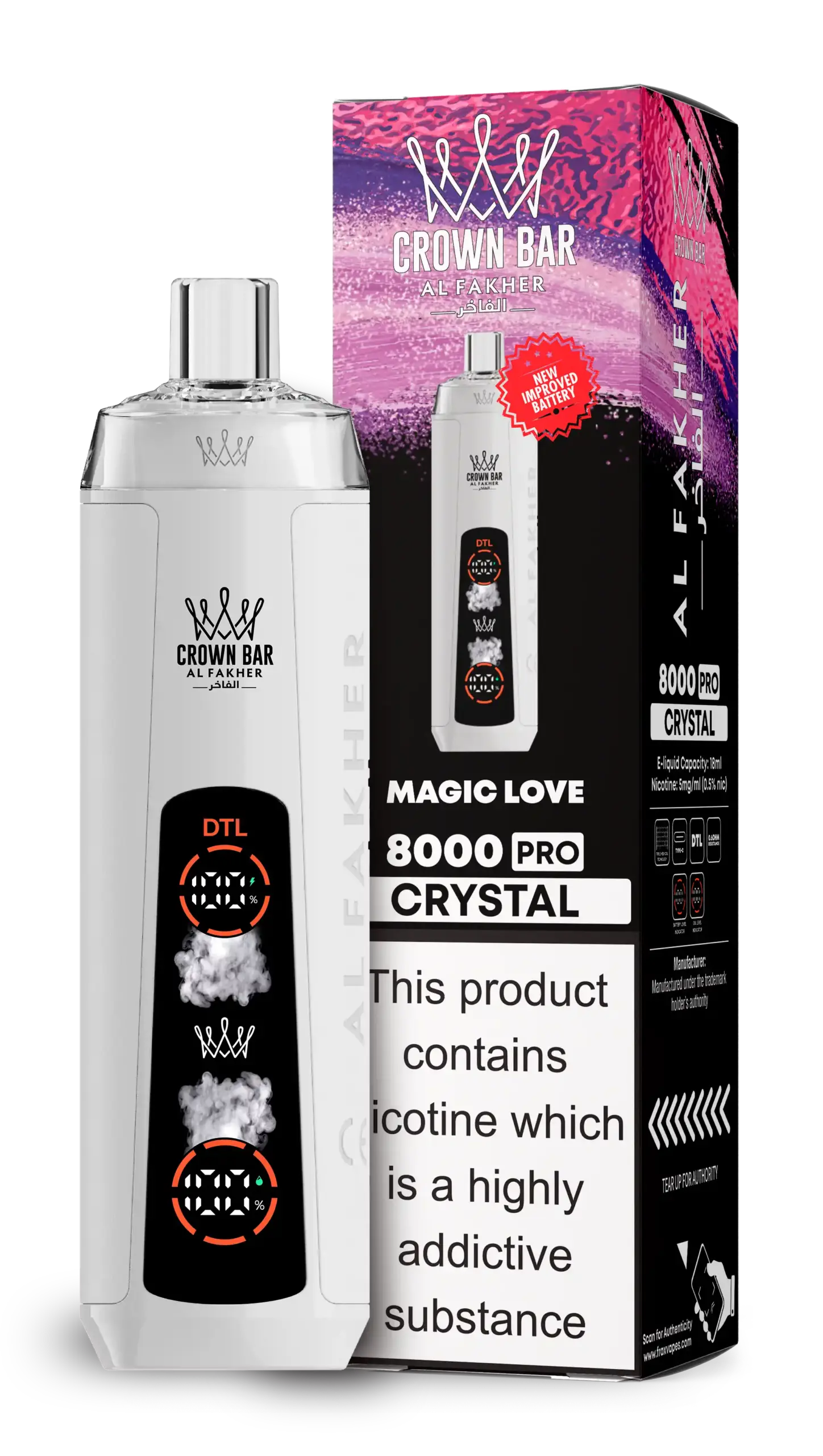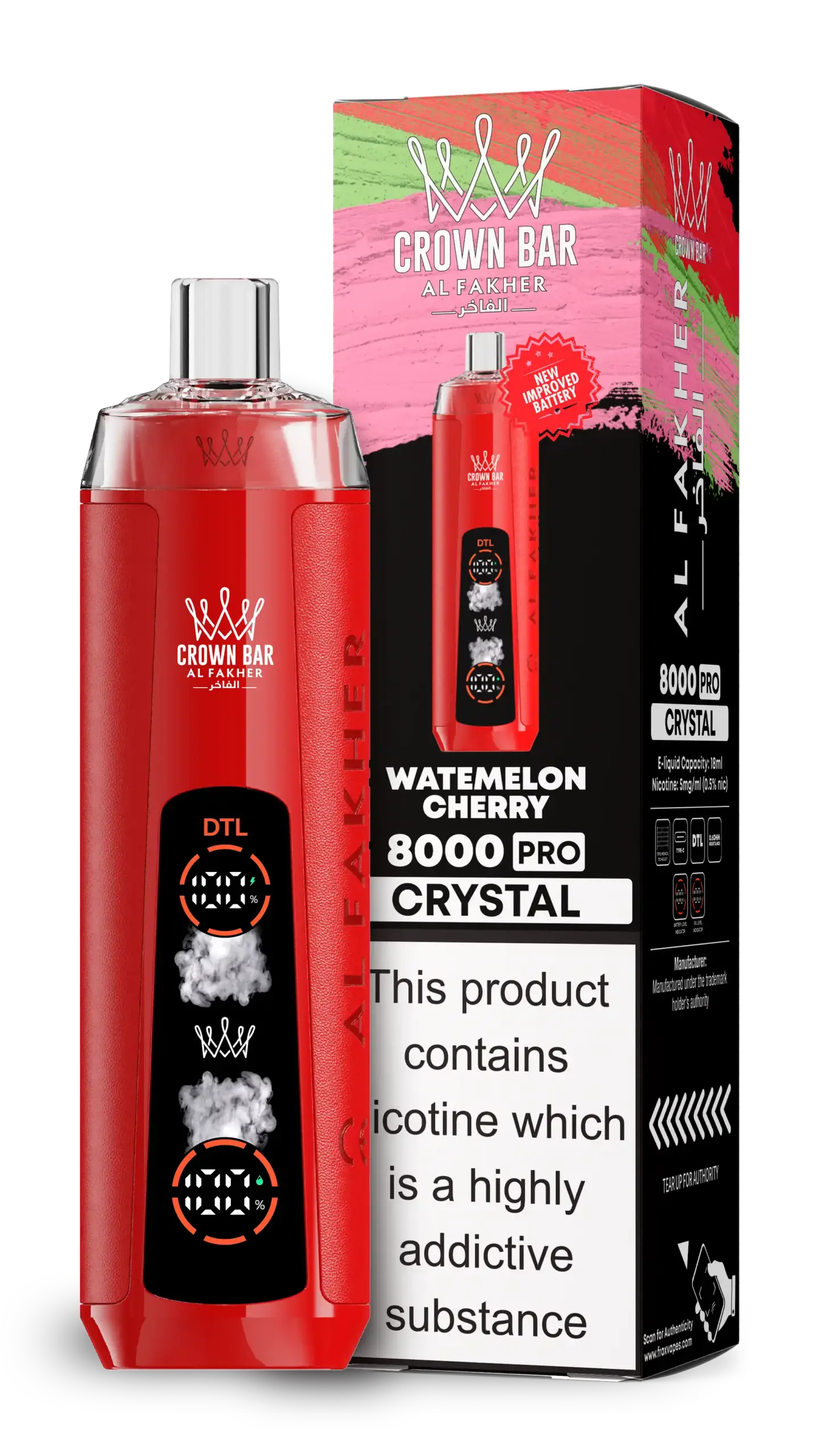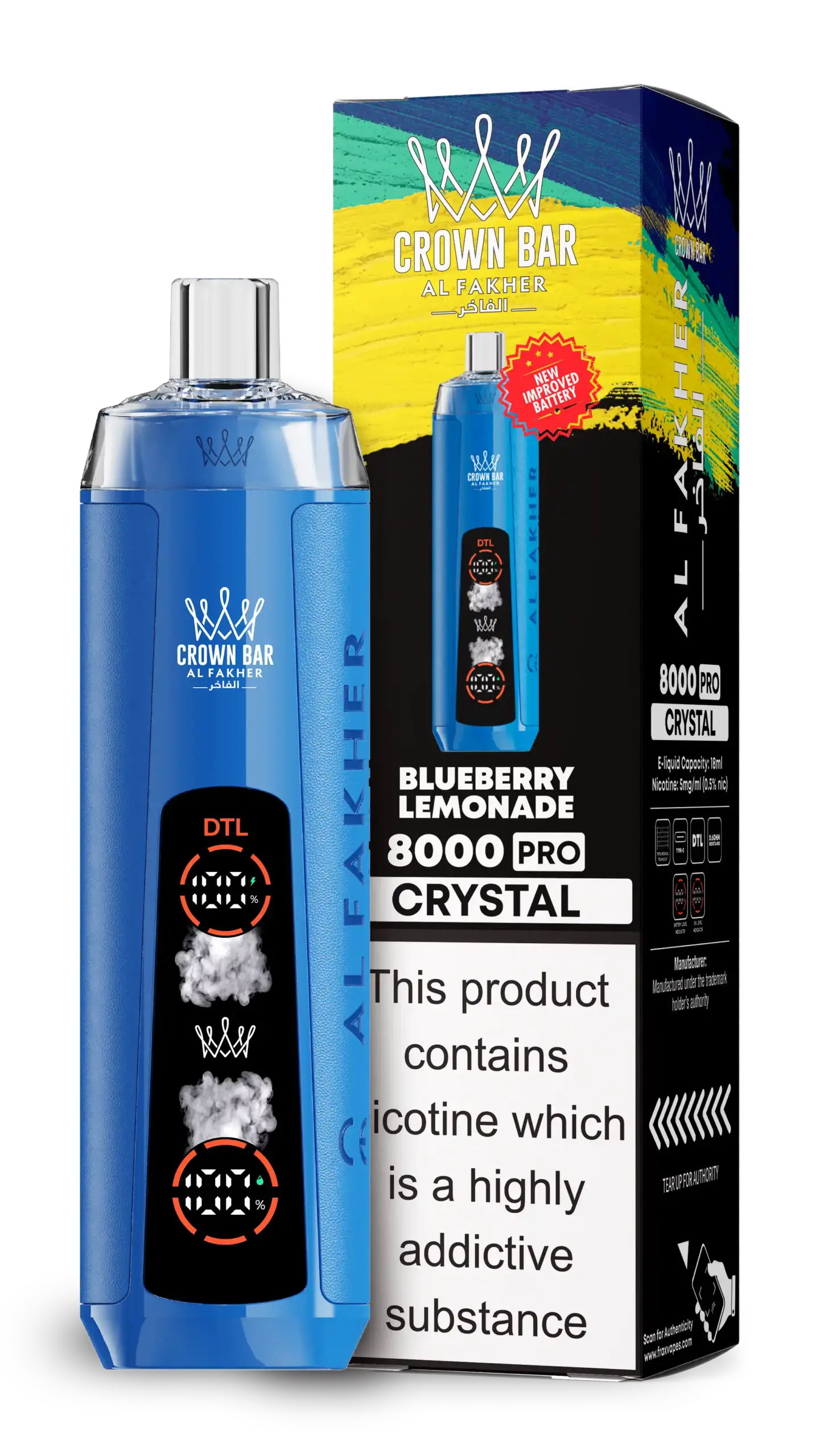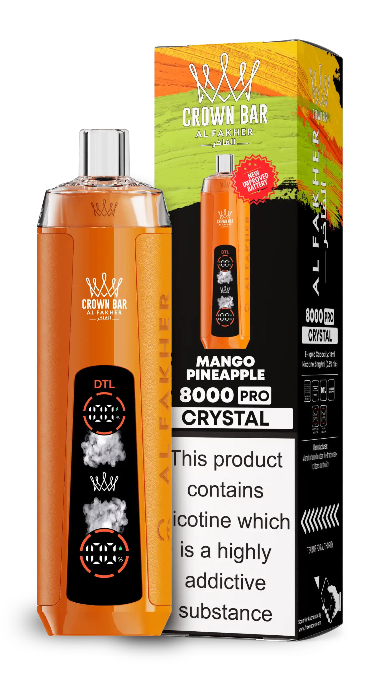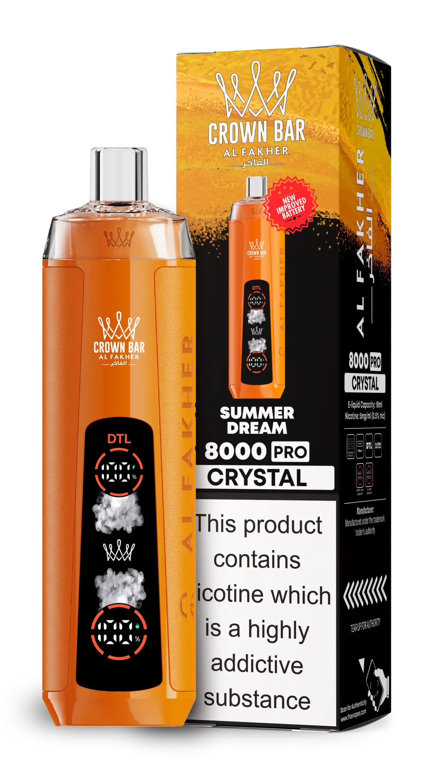 The Al Fakher Crystal 8000 is a compact higher-capacity disposable for users who want a more refined daily-use format without moving into an oversized device. Built around the 8000-puff class, with 18ml capacity, a 1200mAh battery, and a broad 45-flavour lineup, it balances practical everyday use with a cleaner crystal-style look. The latest image also gives it a stronger shelf presence, with a leather-like outer finish, clear upper section, and a front screen layout that makes the design feel more polished than a plain basic disposable.