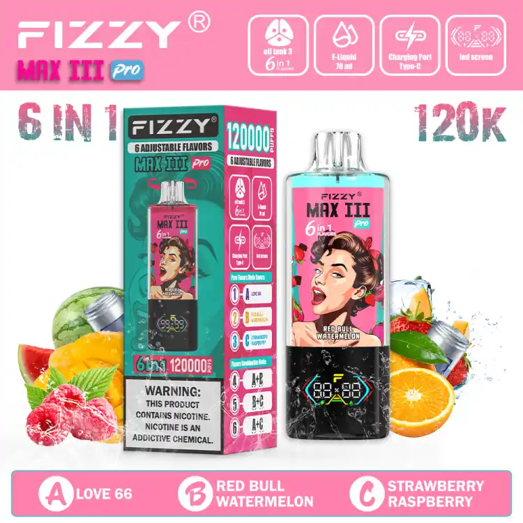 FIZZY Max III PRO 120000 Puffs Vape 6-in-1 LED is designed for adult users who want a high-capacity device with more flavour flexibility in one compact format. The 6-in-1 setup makes it suitable for users who like switching profiles instead of staying with one single taste, while the mesh coil, LED display, and Type-C rechargeable design give it a more feature-led feel than a standard disposable.